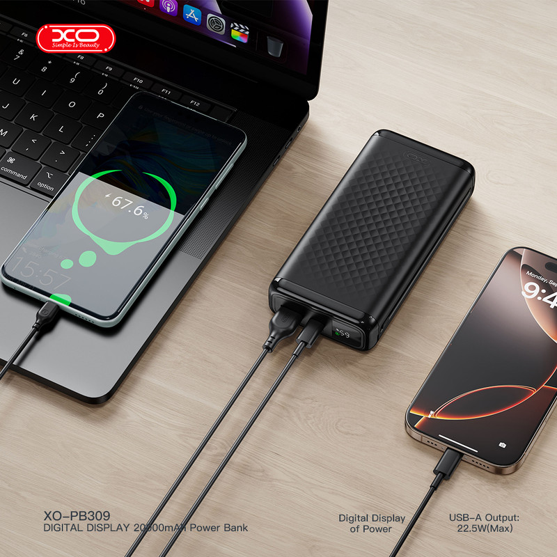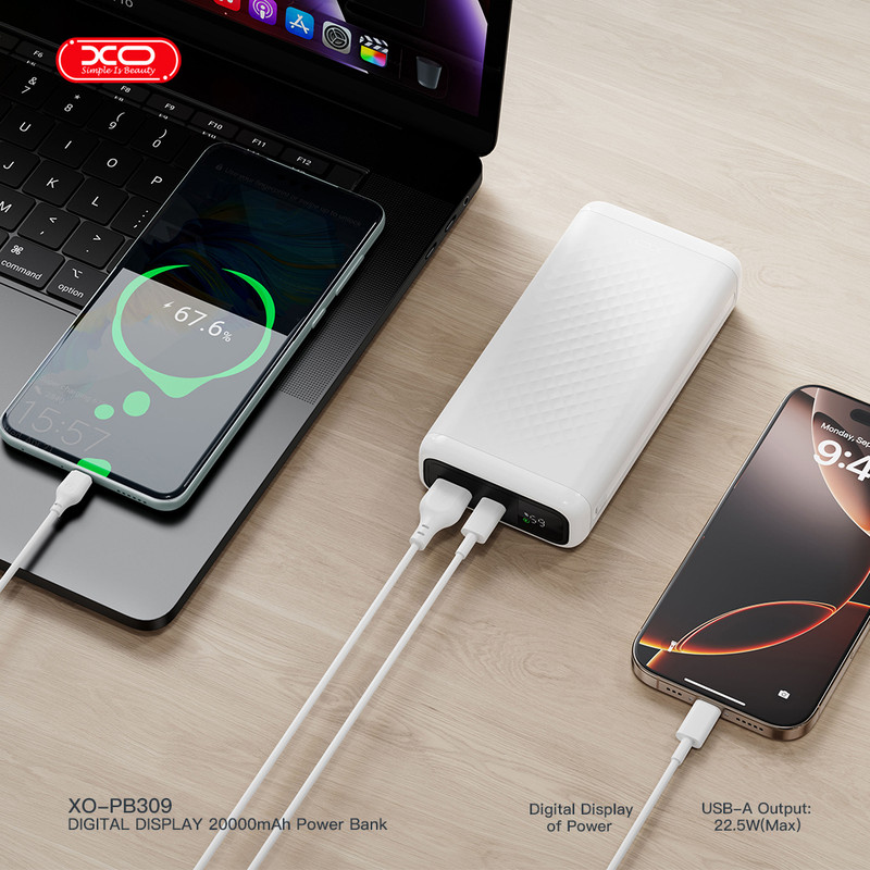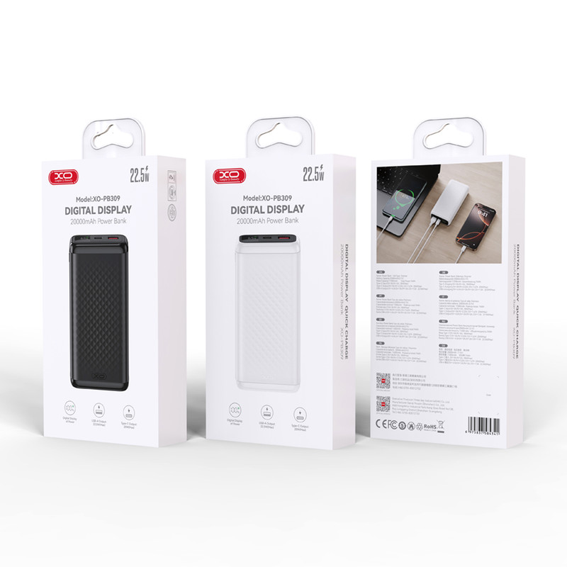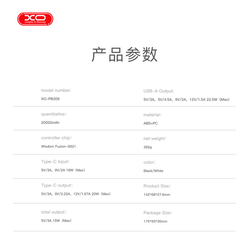 مدل: XO-PB309 ظرفیت: 20000mAh چیپ کنترل: Wisdom Fusion–S621 جنس بدنه: ABS + PC وزن: 392 گرم