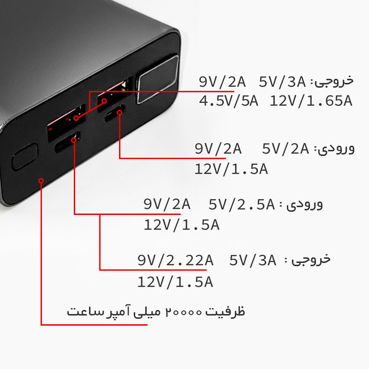 قابلیتهای ویژه: شارژ شدن سریع پاوربانک (با شدتجریان 2.0 آمپر و بالاتر) , امکان شارژ کردن سریعتر موبایل (با شدتجریان 2.0 آمپر و بالاتر) , فناوری USB PD