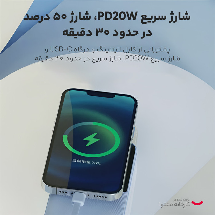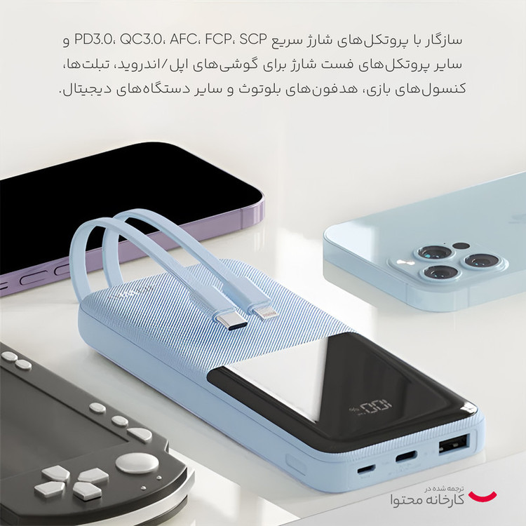 شارژ شدن سریع پاوربانک (با شدتجریان 2.0 آمپر و بالاتر) , مدیریت هوشمند شارژ , تخصیص هوشمند شدت جریان خروجی (Fit Charge) , کابل متصل به بدنه