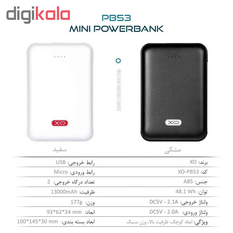 پاور بانک ایکس او مدل PB53 از سری پاور بانکهای نسل جدید mini با حجم ۱۳۰۰۰ میلی آمپر و وزن ۱۷۷ گرم میباشد این پاور بانک داری طراحی زیبا و خوش دستی میباشد که شما هنگام استفاده از این محصول نهایت لذت و راحتی را خواهید برد. و در واقع از مهمترین دلایلی که این پاور بانک را نسبت به مدل های مشابه در این حجم (13000mAh) متمایز میکند وزن کم و حجم کوچک این محصول میباشد