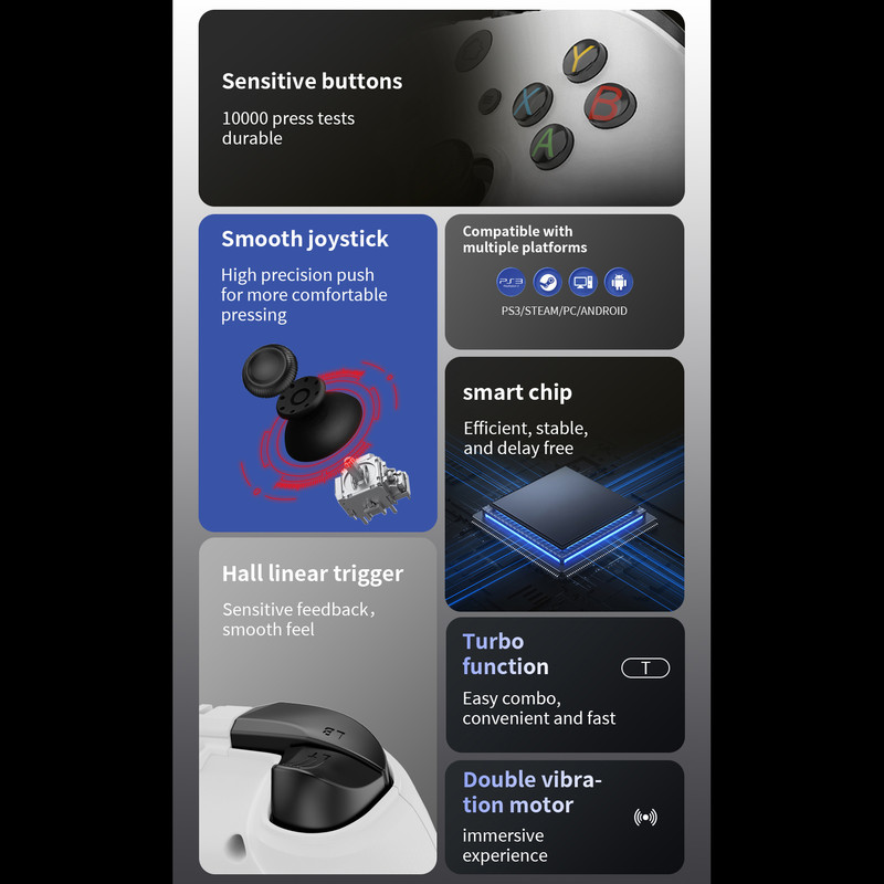 دسته بازی 6 در 1 مدل T-A102L یکی از دستههای بازی با کیفیت و اقتصادی است که با توجه به ویژگیهای خود میتواند گزینهای مناسب برای علاقهمندان به بازیهای ویدویی تلقی شود. این دسته بازی دارای طراحی ارگونومیک و مناسب برای دست است. مواد ساخت این دسته بازی شامل پلاستیک با کیفیت بالا و پدهای انعطاف پذیر است که باعث راحتی و استحکام در برداشتن دسته بازی میشود. این دسته بازی دارای 22 کلید قابل برنامه ریزی است که امکان تنظیم آنها برای بازیهای مختلف را به کاربر میدهد. همچنین دقت و حساسیت بالای این دسته بازی در بازیهای شلیکی، رانندگی و ... بسیار مطلوب است. این دسته بازی با انواع سیستمهای کامپیوتری، لپ تاپها و گوشیها و تبلتهای اندرویدی قابل استفاده است و با اتصال به دستگاه، به صورت خودکار شناخته می شود. این دسته بازی دارای قابلیت اتصال باسیم است.