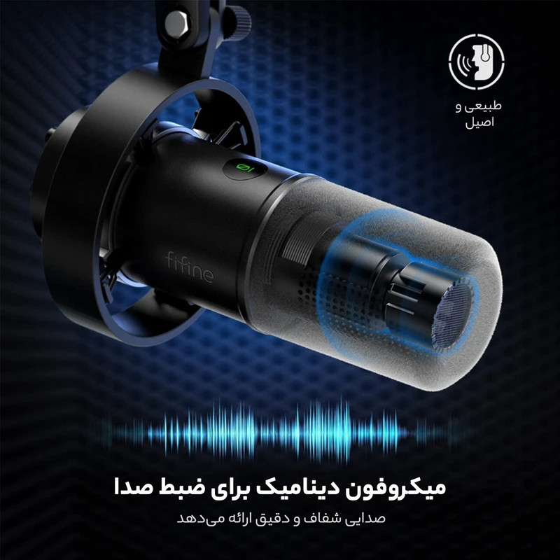 برند فایفاین(FIFINE) و این بار یک میکروفون داینامیک حرفه ای با قابلیت اتصال دوگانه XLR و USB . فرقی نمی کند که شما فقط یک گوشی یا لپتاپ ساده داشته باشید و یا یک استودیو کاملا مجهز، این میکروفون برای هر دو حالت مناسب شما است. با قابلیت اتصال USB میتوانید به وسیله یک کابل USB میکروفون را مستقیم به کامپیوتر، گوشی و یا حتی پلی استیشن و …. وصل کنید. کپسول داینامیک با الگوی کاردیوئید بسیار کارآمد این میکروفون طوری طراحی شده که صدایی را دریافت کند که در مقابل آن و از فاصله نزدیک باشد. بنابراین با FIFINE K688 زیاد نگران نویز های محیطی و صداهای مزاحم اطراف خود نباشید. با فایفاین k688 در یک اتاق ساده که هیچ پوشش یا پنل آکوستیک در آن وجود ندارد می توانید صدای بسیار با کیفیت و گرم و بدون نویز را رکورد کنید.از طرفی قابلیت اتصال XLR امکان وصل کردن میکروفون به تجهیزات حرفه ای مثل میکسر و کارت صدا را به شما میدهد. بنابراین با میکروفون فایفاین K688 هیچ محدودیتی برای انواع دستگاها و تجهیزات وجود ندارد. پیچ های تنظیم صدا و دکمه قطع و وصل فقط در حالت USB فعال هستند و کار می کنند. بوسیله پیچ تنظیم صدای ورودی می توانید به راحتی میزان صدای ورودی خود را به میکروفون کنترل کنید، و نیازی به کم و زیاد کردن صدا از داخل نرم افزار نیست. پشت میکروفون یک جک 3/5 میلیمتری وجود دارد که میتوانید هدفون یا هندزفری خود را به آن وصل کنید.
