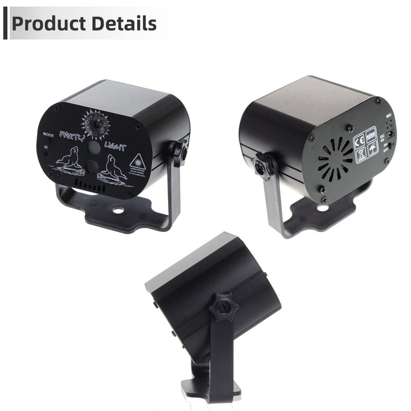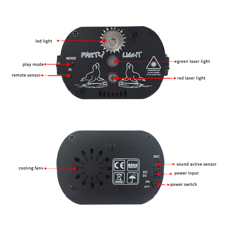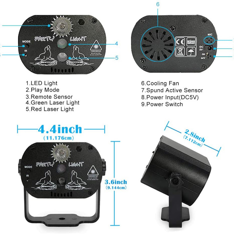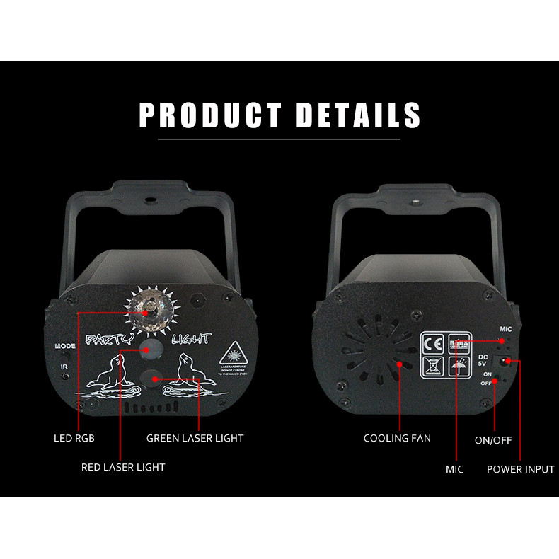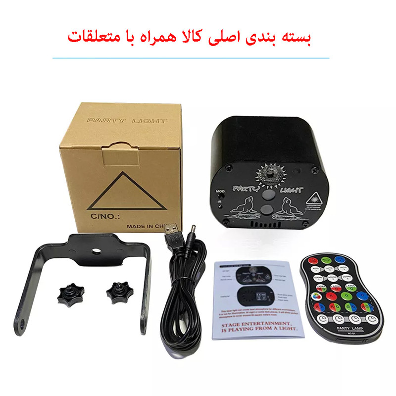 رقص نور پارتی لایت مدل استیج یک رقص نور لیزری فوق العاده با کیفیت میباشد این رقص نور دارای سنسور صدای قوی و با دقت میباشد که میتواند تم های رقص نور را با موزیک هماهنگ کند این رقص دارای عمر متوسط 36000 ساعت میباشد و دارای یک ریموت 24 کلید که با استفاده از آن میتوانید این رقص نور را کامل تنظیم کرده و حتی تایم ها را نیز با آن تنظیم کنید و دارای کلید روشن و خاموش در ریموت بوده که هیچ نیازی به دست زدن به رقص نور پس از نصب نمیباشد در در قسمت جلوی رقص نور یک کلید تنظیم MODE و یک سنسور IR وجود داشته که میتوانید هم به صورت دستی و هم با ریموت تمامی مدها را تنظیم کنید قسمت پشت رقص نور یک کلید روشن و خاموش و میکروفون جهت دریافت صدای موزیک و یک فن خنک کننده قوی و پورت شارژر وجود دارد این رقص نور دارای کابل 2 متری جهت اتصال به انواع شارژر موبایل و تبلت بوده و در جعبه دستگاه یک پایه نگهدارنده جهت اتصال به سقف استیج و دوعدد پیچ دست پیچ و یک ریموت 24 کلید و یک دفترچه راهنمای لاتین وجود دارد رقص نور پارتی لایت میتوانید 120 تم لیزری هم به صورت تکی و هم به صورت ترکیبی ایجاد کند وبا این ابعاد مناسب استیج های بزرگ و سالن های بزرگ نیز میباشد جنس بدنه این رقص نور از نوع الومینیوم با رنگ مشکی میباشد