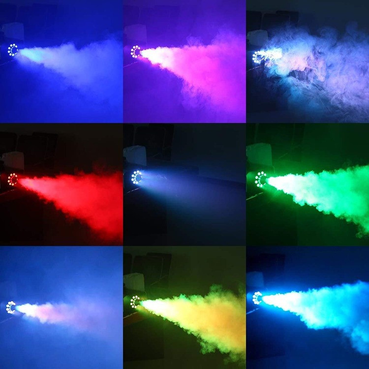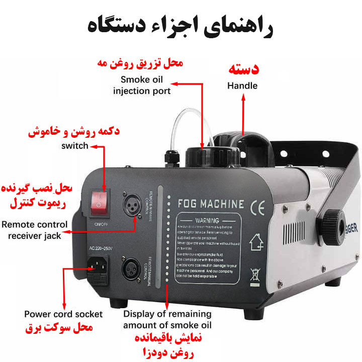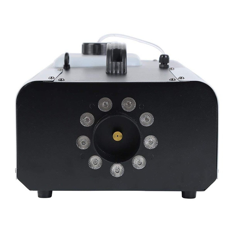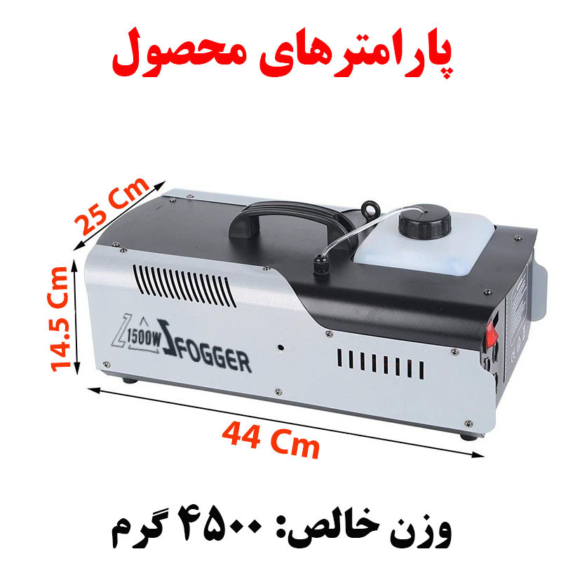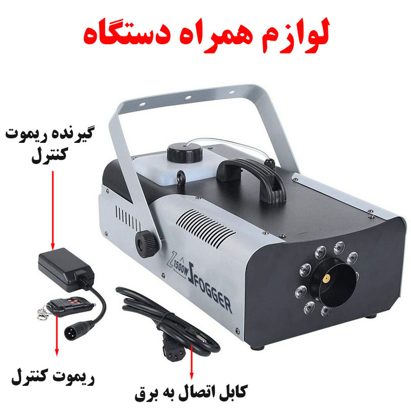 یک ماشین تولید مه یا دود و یا بخار می باشد که با تبخیر مایع مخصوص مه ساز می تواند فضای یک مهمانی را مه آلود کند و هنر نمایی انواع رقص نور ها را دو چندان کند ، بی شک عدم وجود این دستگاه ، قابلیت های متنوع و جذاب رقص نور ها را نمایان نمی کند . لوازم جانبی همراه این دستگاه علاوه بر کابل و براکت نصب ، شامل پدال سیمی ، رموت و گیرنده وایرلس فرمان ، برای ایجاد مه در فواصل زمانی متعدد می باشد. استفاده از مایع مرغوب که در همین مجموعه قابل تهیه می باشد ، به دوام و کاربرد بهتر این دستگاه کمک می کند . در ضمن تعداد 9 عدد ال ای دی با رنگ های متنوع در محل خروج مه فضای مه آلود و رنگی بسیار زیبایی ایجاد می کند.