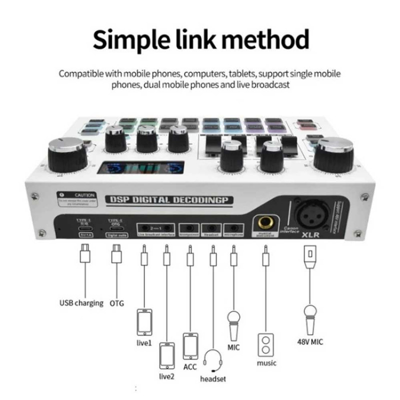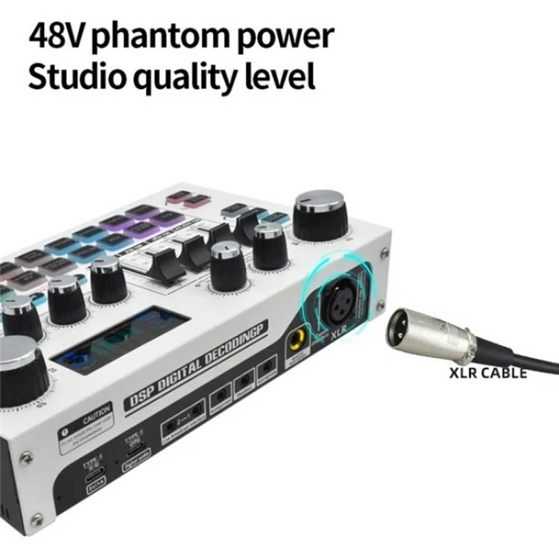 از قابلیت های این کارت صدا میتوان به داشتن باتری و بلوتوث داخلی ، فاتوم پاور 48+ ولت داخلی ، قابلیت کاهش نویز ، Dodge ، تنظیم صداهای bass ، treble و Mid ، امکان اتصال موبایل و برگزاری لایوهای اینترنتی ، اتصال انواع میکروفون ، داشتن افکت های صوتی که بر روی صدا اعمال می شود ، قابلیت اکو یا ریورب ، امکان کارائوکه و همخوانی با خواننده ، داشتن افکت های متنوع مانند دست زدن و صدای خنده و غیره ، داشتن 4 دکمه جهت وارد کردن افکت دلخواه به مدت 10 ثانیه ، قابلیت تغییر صدا و غیره اشاره کرد.