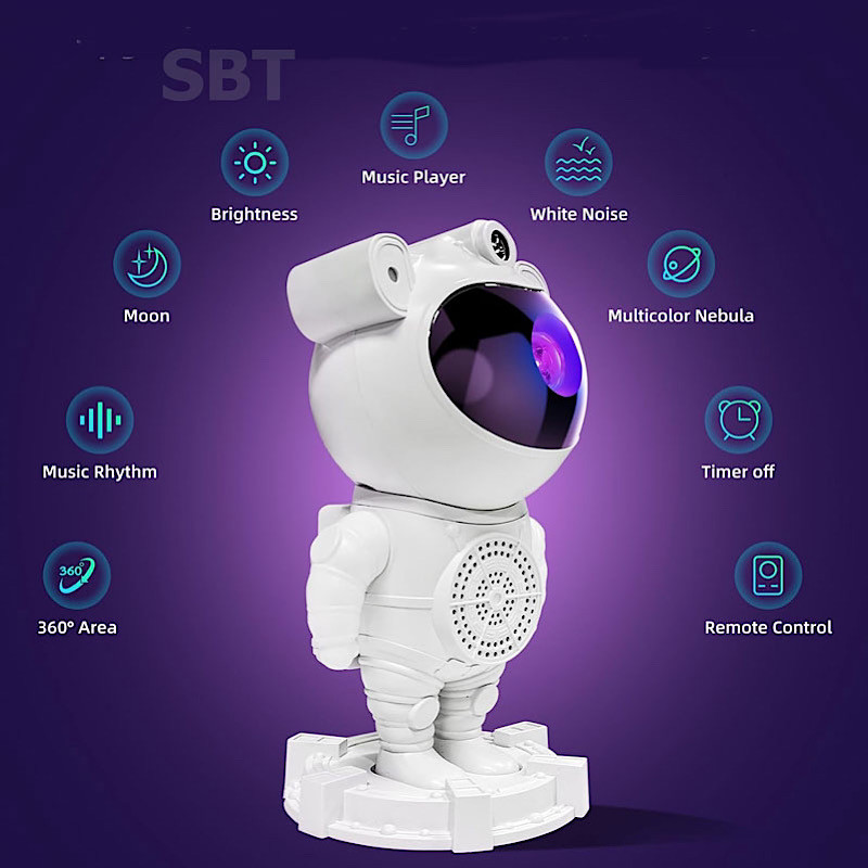 پروژکتور کهکشانی طرح فضانورد مدل اسپیکر دار یک چراغ خواب یا نورپردازی با قابلیت پخش افکت تصویر زنده کهکشانی در رنگ های مختلف به همراه لیزر ستاره ای بر روی سقف و دیوار اتاق یا هر سطح دیگری است که به همراه افکت لیزر ستاره ای حس یک سفر کهکشانی را قبل از خواب به شما میدهد . این پروژکتور کهکشانی دارای یک اسپیکر بلوتوثی در قسمت پایه زیرین نیز هست که میتواند برای شما هر موسیقی آرامش بخشی را پخش نمایید تا بتوانید با آرامش به خواب بروید برای روشن شدن بلوتوث اسپیکر دکمه کوچک روی پایه را فشار دهید تا روشن بشود . تلفیق همزمان تصویر زنده کهکشانی و لیزر ستاره ای و اسپیکر بلوتوثی جذابیت اتاق خواب و خواب شما را چندین برابر میکند . این محصول دارای ریموت کنترل نیز می باشد که میتواند نور پرژکتور یا لیزر را کم یا زیاد و یا برای روشن ماندن محصول تایمر تعریف کنید که سر ساعت مشخص شده محصول خاموش بشود.