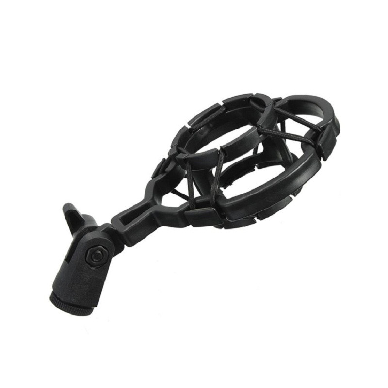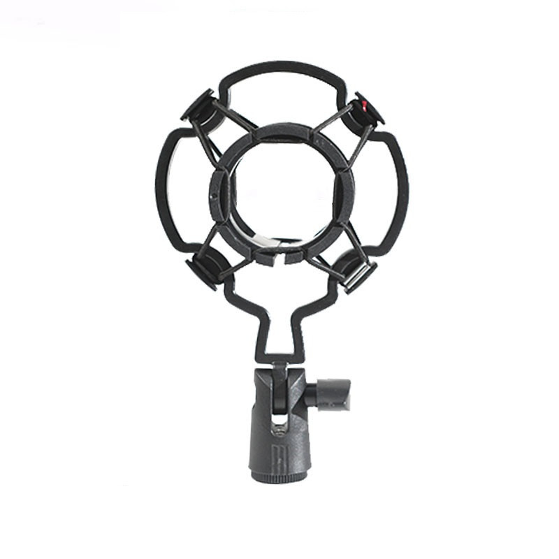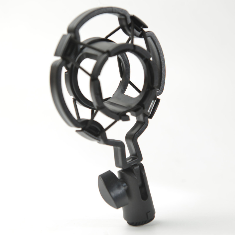 لرزش گیر میکروفون معمولاً شامل یک محفظه یا حلقه از جنس پلاستیکی است که میکروفون را درون آن قرار می دهند تا باعث جذب لرزشهای ناخواسته شود. این وسیله به ویژه برای میکروفونهایی که در صدای ضبط شده حساسیت بالایی دارند، مانند میکروفونهای کاندنسر یا حتی برای میکروفونهای داینامیک مطرح است.