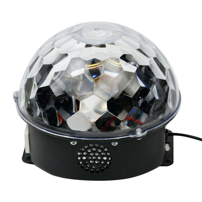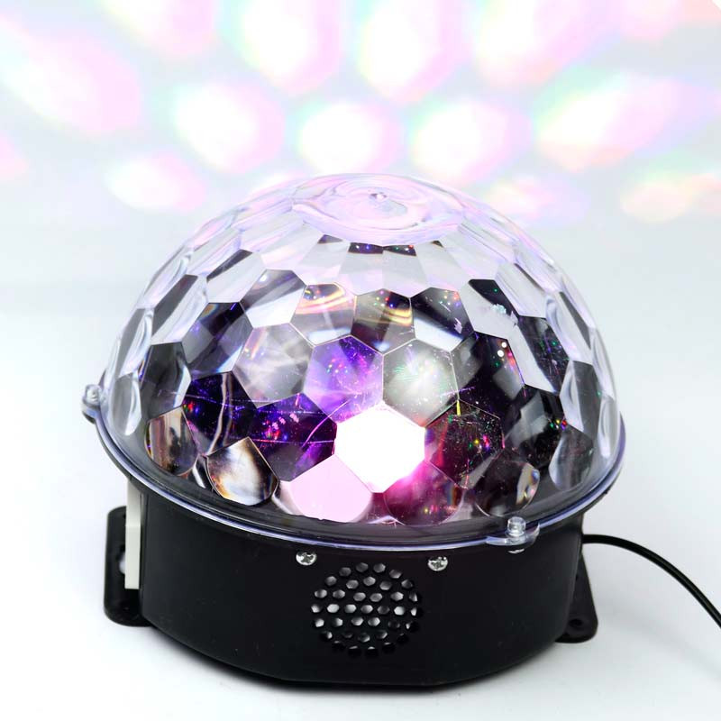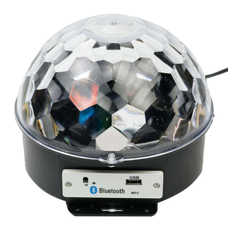 لامپ LED مدل Magic Ball به شکل توپ شیشه ای و بسیار شیک طراحی شده است که همراه با رقص نور زیبا از پخش موسیقی باکیفیت صدایی مناسب نیز برخوردار می باشد. این چراغ نور موزیکال به صورت بی سیم توسط بلوتوث به گوشی موبایل، تبلت و دیگر دستگاه ها به سرعت جفت می شود، همچنین پورت USB نیز برای آن تعبیه شده که با اتصال فلش مموری می توانید به آرشیو آهنگ ها و دیگر فایل های صوتی نیز به راحتی دسترسی داشته باشید. بلندگوهای قدرتمندی برای این لامپ LED بلوتوثی درنظر گرفته شده که صدایی رسا و استریو با بیس عالی را به گوش می رسانند و همراه با رقص نور به خصوص در محیط های تاریک و نورافشانی های دلنشین بر روی دیوار جذابیت آن را دو چندان نشان می دهد. منبع انرژی این چراغ LED بلوتوثی و فلش خور از طریق برق شهری با ولتاژ ورودی 100 تا 240 ولت تامین می شود و یک ریموت نیز همراه آن قرار دارد که مدیریت رقص نور، پخش موسیقی، حجم ولوم و … از راه دور نیز برای کاربر امکان پذیر باشد.