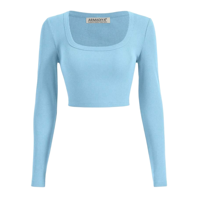نشان برند ARMADIYA در کناره داخلی | جنس: پارچه فانریپ کبریتی کشی | مدل: کراپتیشرت (نیمتنه) آستین بلند، یقه اسکوپی | سایز: دارای تنوع سایز (راهنمای سایز در تصاویر محصول)