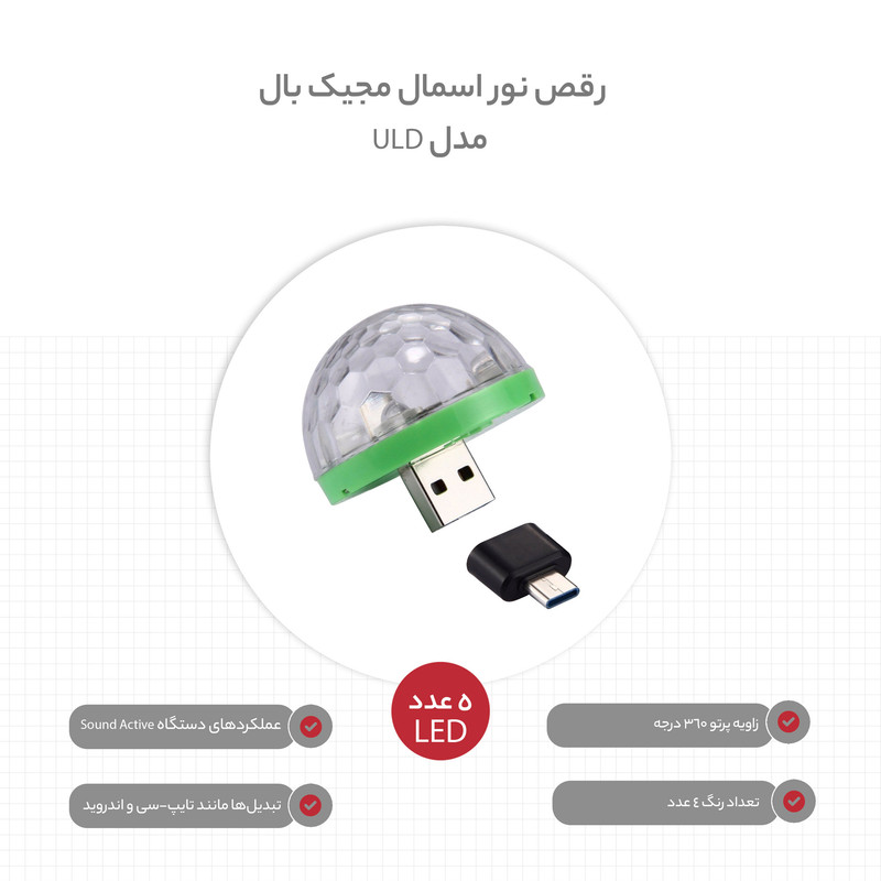 این محصول رقص نور برای مراسم و مجالس عروسی و جشن تولد و سالگرد ازدواج خصوصی و هر مناسبتی که میخواهید به سرعت فضای آن مجلس را تبدیل به یک میهمانی با نشاط و ویژه کنید مناسب است. آن هم بدون نیاز به دستگاههای رقص نور لیزری گرانقیمت! شما میتوانید با بردن این وسیله کوچک و کاربردی به یک میهمانی ساده، در عرض یک دقیقه آنجا را به یک میهمانی خوب و به یاد ماندنی برای میهمانان و میزبانان تبدیل کنید و این بهترین کادو و هدیهای ماندگار و دوست داشتنی از طرف شما برای میزبان خواهد بود. رویه طلقی مشجر این لامپ رقص نور USB بسیار شفاف و روشن بوده تا نورهای رنگی را به خوبی از خود عبور دهد. با استفاده از این دستگاه رقص نور در مکانهای مختلف منزل به ویژه اتاق کودک دلبندتان، شور و شادی را برای خانواده خود به ارمغان ببرید. داشتن این وسیله کوچک رقص نور میتواند زندگی را از حالت روتین و تکراری خارج کند و کمی حس زنده بودن به زندگی تزریق کند. برای نصب رقص نور USB نیازی نیست کار خاصی انجام دهید، فقط کافیست آن را با تبدیل OTG که دارد به تلفن همراه و به یو اس بی کامپیوتر، لپ تاپ، تلویزیون یا هر وسیلهی الکترونیکی دارای خروجی یو اس بی وصل کرد.