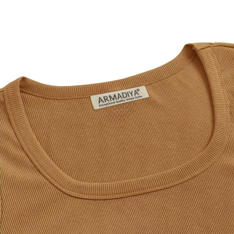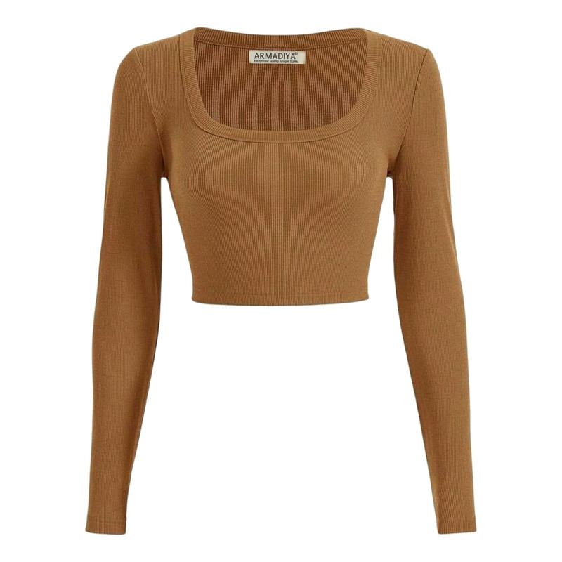 نشان برند ARMADIYA در کناره داخلی | جنس: پارچه فانریپ کبریتی کشی | مدل: کراپ تیشرت (نیمتنه) آستین بلند، یقه اسکوپی | سایز: دارای تنوع سایز (راهنمای سایز در تصاویر محصول)