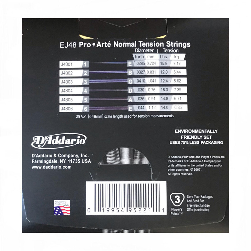 سیم گیتار کلاسیک EJ48 با کشش نرمال،جزو پرفروشترین سیمهای گیتار کلاسیک به شمار میرود.کیفیت تمام سیمهای گیتار سری Pro Arte داداریو با دقت بسیار بالا به صورت لیزری بررسی میشود تا از طول، قطر و کشش مناسب آن اطمینان حاصل شود.کیفیت مناسب و صدادهی با ثبات از جمله ویژگیهای سیم گیتار کلاسیک EJ48 به حساب میآیند.