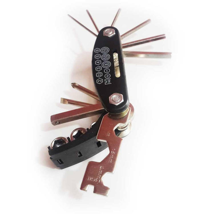دارای 6 آچار آلن سایز های 2 و 2.5 و 3 و 4 و 5 و 6 سه عدد بکس سایزهای 8 و 10 و 15 پیچ گوشتی دو سو و چارسو آچار تخت سایز 8 و 10 و 15