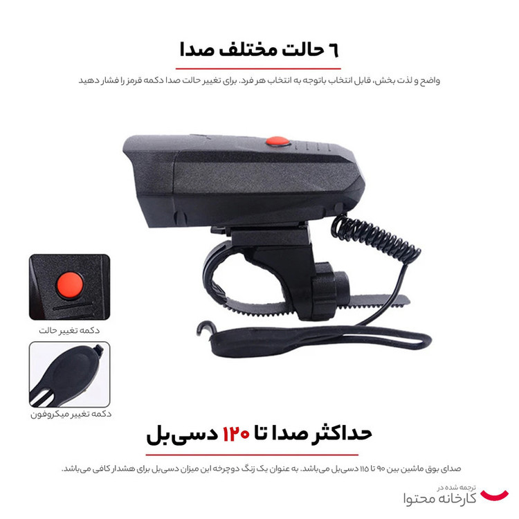 دارای صدای بسیار بلند 120 دسیبل دارای 6 نوع بوق مختلف قابل تنظیم مصرف باتری بسیار عالی دارای شاسی بوق جداگانه