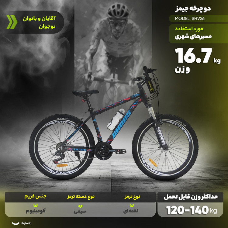 دوچرخه شهری جیمز مدل SHV26 یکی از گزینههای قابلاتکا برای تردد روزمره در شهر است که با در نظر گرفتن نیازهای کاربران نوجوان و بزرگسال، طراحی شده تا هم برای آقایان مناسب باشد و هم بانوان. این دوچرخه با تیپ شهری و طراحی ساده و خوشفرم خود، بیشتر برای مسیرهای آسفالت و استفاده روزمره شهری کاربرد دارد. بدنه آن از آلومینیوم ساخته شده که همزمان وزن دوچرخه را کاهش داده (حدود ۱۶.۷ کیلوگرم) و در عین حال، مقاومت مناسبی برای تحمل وزن تا حدود ۱۴۰ کیلوگرم فراهم کرده است. سایز طوقه ۲۶ اینچی، همراه با تایرهای KENDA مدل ۲.۳۵ و توپی چرخ ضامندار، حس پایداری و کنترل خوبی روی مسیر ایجاد میکند. سیستم تعلیق Hard Tail با دوشاخ قفلشونده و آلومینیومی، اجازه میدهد بسته به نوع مسیر، فرمانپذیری را تنظیم کنید. سیستم ترمز از نوع لقمهای (ویبریک) و برند ماکان است که با دسته ترمز آلومینیومی و سبک، عملکردی ساده ولی قابلاعتماد ارائه میدهد. در بخش پیشرانه، ۲۱ دنده قابل انتخاب در اختیار دارید که از ترکیب طبق قامه سهسرعته و خودرو هفتسرعته ماکان تشکیل شدهاند؛ این مجموعه همراه با دستهدنده کلاچدار، امکان تنظیم سرعت در شرایط مختلف شهری را فراهم میکند. سایر بخشها مانند پدالهای ABS، زین ساده اما راحت از جنس پلیاورتان و گریپ لاستیکی، نشان میدهند که در این دوچرخه هم به عملکرد فکر شده و هم به راحتی کاربر.