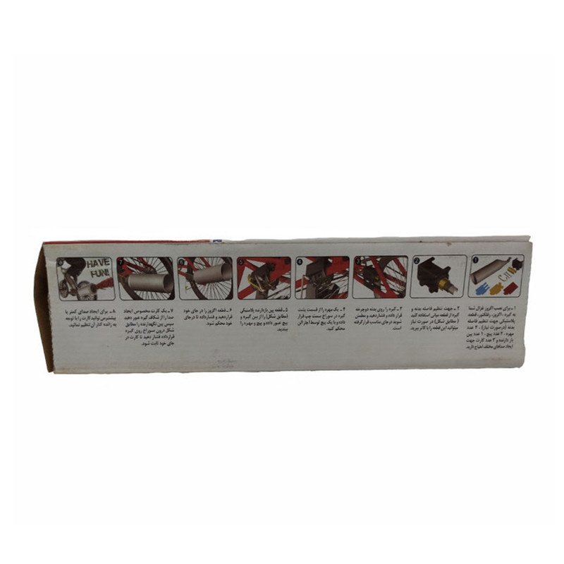اگزوز دوچرخه مدل T100 یک وسیله جذاب و منحصر به فرد میباشد که میتواند لذت دوچرخه سواری را چند برابر کند.اگزوز دوچرخه M10قابلیت این را دارد که به تمام دوچرخه ها و سایزهای مختلف اتصال یابد و با کارت های مخصوص ایجاد صدا که شامل سه عدد میشود یک دوچرخه سواری هیجان انگیز را به دوچرخه سوار بدهد. توضیحات نصب:1-برای نصب اگزوز شما به گیره،اگزوز،رفلکتور،قطعه پلاستیکی جهت تنظیم فاصله بدنه(در صورت نیاز)، 2 عدد مهره، 2 عدد پیچ، 1 عدد پین بازدارنده، 3 عدد کارت جهت ایجاد صداهای مختلف احتیاج دارید. 2-جهت تنظیم فاصله بدنه و گیره از قطعه میانی استفاده کنید.( مطابق شکل ) در صورت نیازمیتوانید این قطعه را با کاتر ببرید. 3_گیره را روی بدنه دوچرخه قرار داده و فشار دهید و مطمئن شوید در جای مناسب قرار گرفته است. 4-یک مهره را از قسمت پشت گیره در سوراخ سمت چپ قرار داده و با یک پیچ توسط آپار آلن محکم کنید. 5-قطعه پین بازدارنده پلاستیکی (مطابق شکل) را از بین گیره و پیچ عبور داده و پیچ و مهره را ببندید. 6-قطعه اگزوز را در جای خود قرار داده و فشار داده تا در جای خود محکم شود. 7- یک کارت مخصوص ایجاد صدا را از شکاف گیره عبور دهید سپس پین نگهدارنده را مطابق شکل درون سوراخ روی گیرهقرار دادهفشار دهید تا کارت در جای خود ثابت شود. 8-برای ایجاد صدای کمتر یا بیشتر میتوانید کارت را با توجه به زاِئده کنار آن تنظیم نمائید.