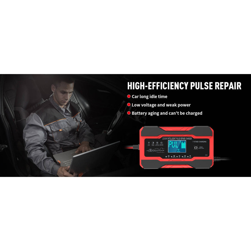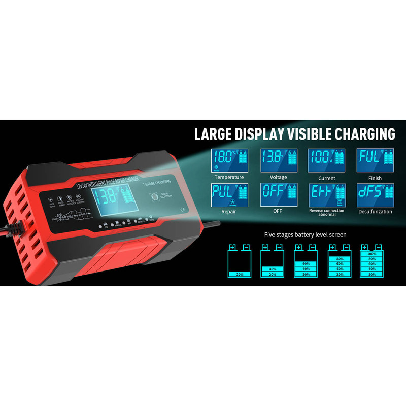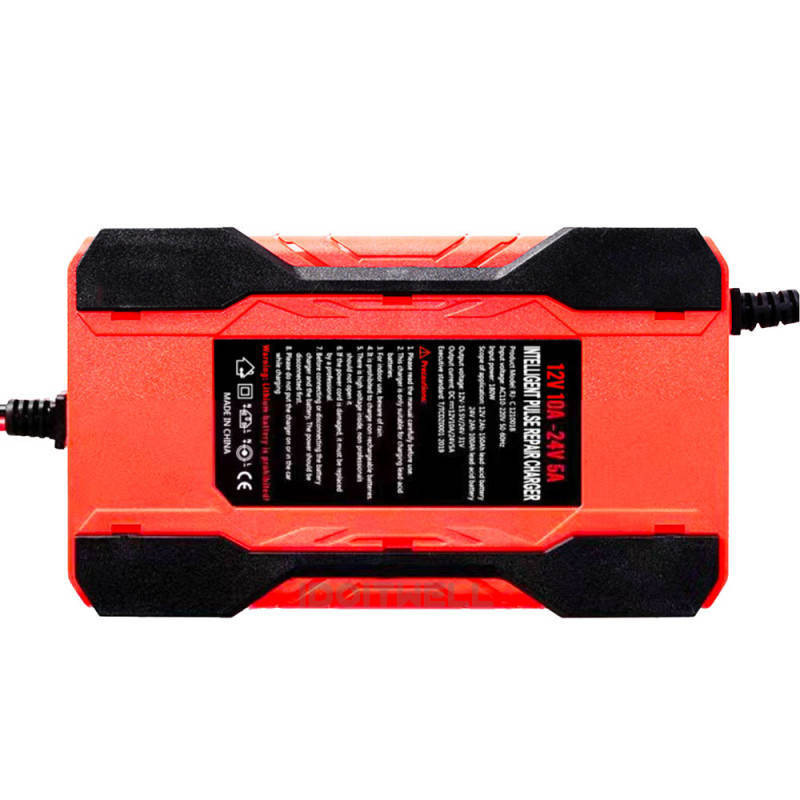 دستگاه شارژر باتری اتوماتیک فوق پیشرفته 7 مرحله ای تیانی RJTiyanye مدل RJ-C121001A هوشمند خانگی سوئیچینگ اتوماتیک- دارای آپشن تزریق پالسی جهت بازیابی و احیای تقریبی سلولهای نیمه فعال و خراب باطری- با حداکثر خروجی 10 آمپر برای 12 ولت و 5 آمپر برای 24 ولت- مناسب برای باتریهای 2 الی 150 آمپری 12 ولت و باتریهای 2 الی 100 آمپری 24 ولت- قابلیت تشخیص اتوماتیک ولتاژ باطری- مخصوص باتری های 12 ولتی و 24 ولتی سلید اسیدی (سرب اسید)- 5 حالت قابل انتخاب جهت شارژ- حالت شارژ باطری ماشین- حالت شارژ باطری های ژل و AGM