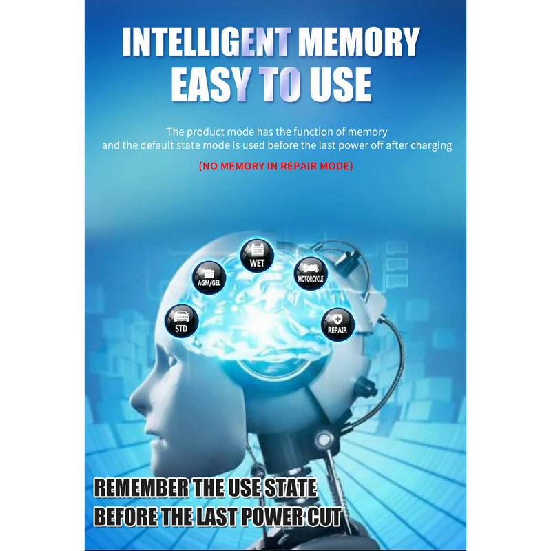 حالت شارژ باطری های باتری تر (wet) یا وت شارژ (مناسب باطریهای وت یا لیداسید کوچک)- حالت شارژ باطری موتورسیکلت (2 الی 20 آمپر)- حالت پالسی (تعمیر و بازیابی، احتمال بازیابی باطریهای قدیمی یا بلااستفاده و خراب)- نظارت اتوماتیک مراحل شارژ- اجرای اتوماتیک DFS یا de-vulcanization برای بهبود وضعیت باتریهایی که در صورت عدم استفاده صحیح ظرفیت خود را از دست داده اند (ولکانیزاسیون).- دارای فن خنک کننده اتوماتیک مدار و قطعات داخلی شارژر- دارای صفحه نمایش دیجیتالی جهت نمایش آمپر و ولتاژ و وضعیت شارژ و...- دکمه مود لمسی و تاچ- قابلیت انتخاب حالت شارژ در تابستان یا زمستان- محافظت از اتصال معکوس لحظه ای- محافظت در برابر دمای بیش از حد قطعات- محافظت در برابر اتصال کوتاه لحظه ای انبرک ها- قطع خروجی هنگام پر شدن باطری