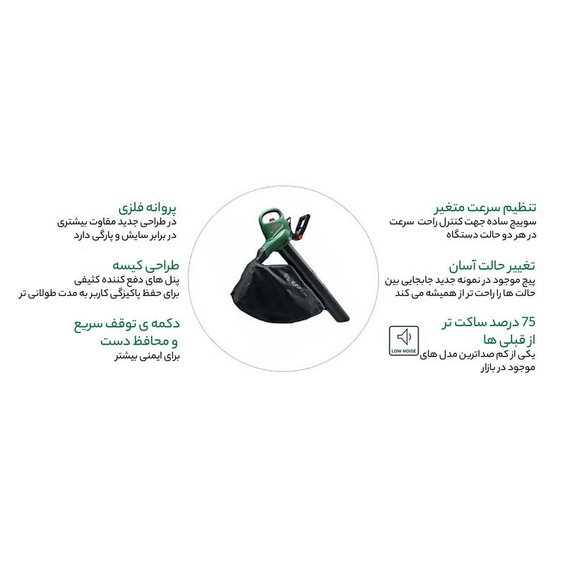شرکت بوش آلمان پرقدرت ترین شرکت تولید لوازم خانگی و ابزارهای صنعتی در دنیا می باشد.از تولیدات این شرکت دستگاه دمنده و مکنده بوش مدل Universal Garden Tidy می باشد که از قدرت مکش و دمش هوای بسیار بالایی برخوردار است. قدرت موتور این دستگاه بسیار بالا است. این دستگاه قادر است تا در هر دقیقه، حجم بسیار بالایی از هوا را جابجا کند.از اینگونه دمنده و مکنده برای تمیز کردن محیطهای وسیع استفاده میشود.موتور این دستگاه 1800 وات واقعی قدرت دارد. این موتور در هر ثانیه 160 لیتر هوا را مکش کرده و یا از نازل دستگاه به بیرون پرتاب میکند و سرعت خروج باد میتواند تا 300 کیلومتر بر ساعت هم افزایش پیدا کند. یک کیسه با ظرفیت 45 لیتر به همراه این محصول در اختیار خریدار قرار میگیرد. از این نوع دمنده و مکنده بیشتر برای جمعآوری برگ و شاخههای ریز درختان از محوطههای بزرگ استفاده میکنند. کیسه مخصوص دستگاه هم که به دستگاه متصل میشود، به همین منظور به کار میرود. وقتی در جنگل هستید، وجود برگهای زیاد روی زمین بسیار طبیعی و زیبا به نظر میرسد. ولی در حیاط منزل ، ریختن این برگها و نامرتب شدن حیاط و محوطه آن، اصلا مطلوب و چشمنواز نیست. اگر شما در حیاط منزل از چند درخت نگهداری میکنید، حتی با رسیدگی مداوم ، از ریزش برگها و شاخههای ریز آن - بهویژه در فصل پاییز - نمیتوانید جلوگیری کنید. دغدغهی جمعکردن این شاخ و برگها از حیاط منزل و یا محوطه ویلا، مسئلهای است که حتما با آن روبرو شدهاید و گاهی حجم آنها به حدی است که جمعآوریشان برای شما غیرممکن به نظر میرسد. دلیل این موضوع، این است که جمعکردن این برگ ها بیشتر با ابزارهای دستی مانند جارو، شنکش و وسایلی از این دست انجام میشود. اما برای صرفهجویی در زمان و انرژی بهتر است از یک دمنده و مکندهی قوی برای جمعآوری شاخ و برگها استفاده کنیم . دمنده و مکنده Universal Garden Tidy یک گزینهی مناسب برای این کار است. این دستگاه با قدرت امکان جمعکردن شاخوبرگ درختان را در کمترین زمان به شما میدهد و بوسیله برگ خرد کن حجم برگ های جمع آوری شده را 12 برابر کمتر می کند . لازم به ذکر است از حالت دمنده این دستگاه پر قدرت هم میتوان برای بسیار از موارد استفاده کرد . تمام موارد کیفی دستگاه باعث شده که این دمنده و مکنده کاملا در دنیا بی رقیب باشد.