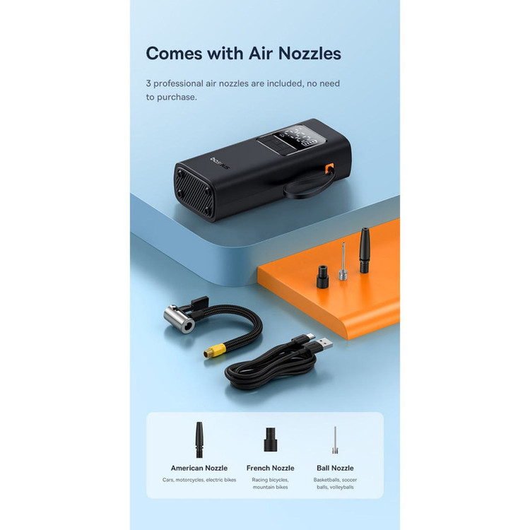 در داخل بسته بندی پمپ باد بیسوس علاوه بر کمپرسور باد، 3 نازل باد و کابل شارژ تایپ سی قرار دارد.