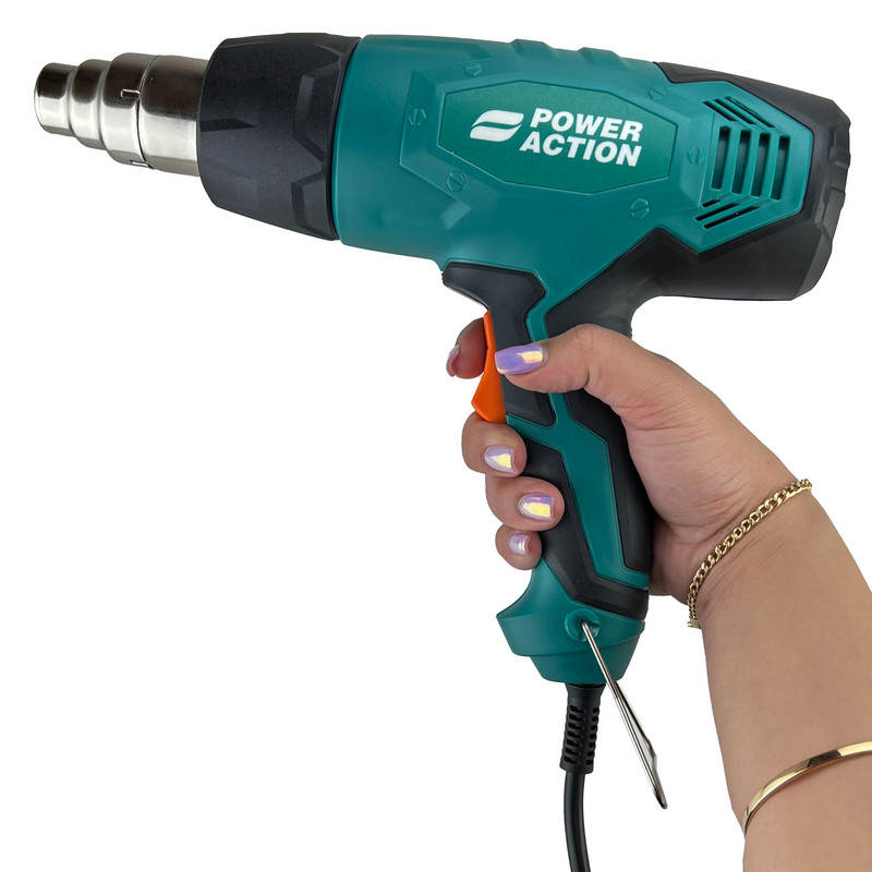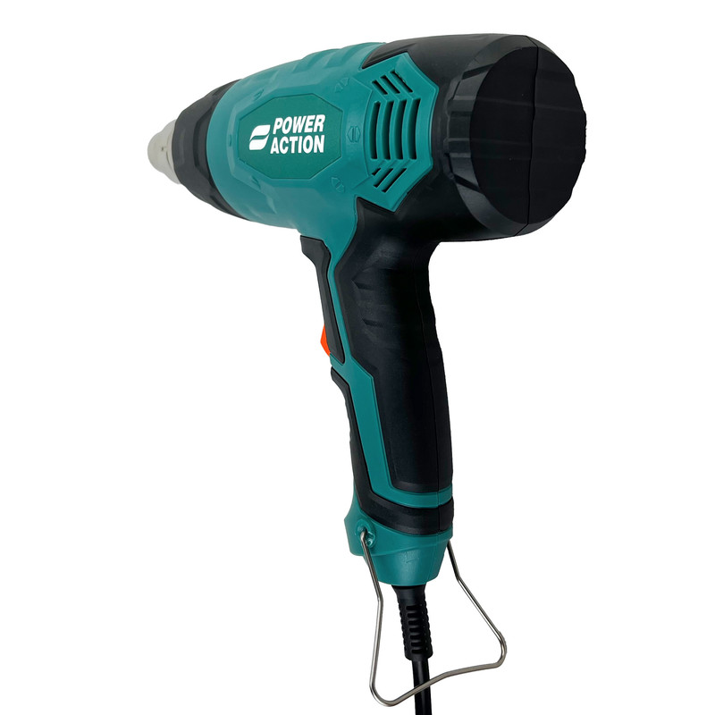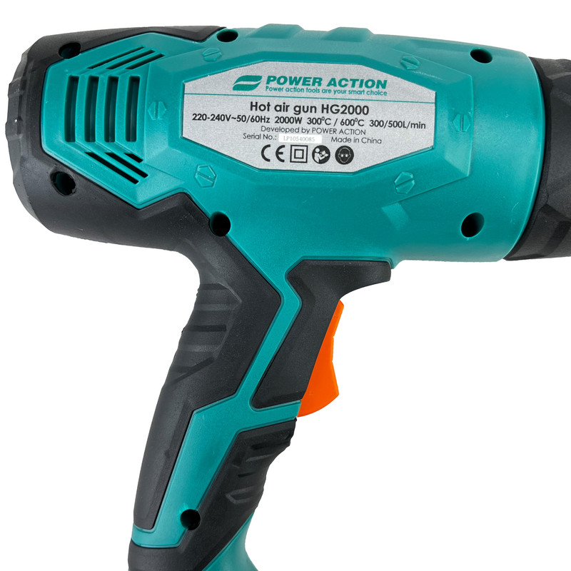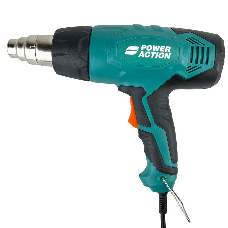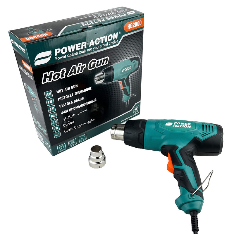 سشوار صنعتی پاور اکشن مدل HG2000 یکی از پر کاربرد ترین دستگاههای برقی نزد افراد فنی میباشد، که با اضافه کردن خلاقیت فردی توانایی فرم دهی و شکل دهی به انواع متریال را در اختیار کاربر قرار میدهد. این ابزارها در صنایع الکترونیک، تزیینات اتوموبیل، صنایع نجاری، صنایع بسته بندی و لوله کشی و رنگ کاری بسیار کاربردی میباشند. کارکرد آنها بسیار شبیه سشوارهای خانگی میباشد با این تفاوت که مقدار درجه حرارت در سشوارهای صنعتی بسیار بالاتر میباشد. سشوار صنعتی پاور اکشن، با داشتن موتور توانمند 2000 واتی یکی از با کیفیت ترین دستگاهها در بین همرده های خود میباشد.المنتهای این محصول از نوع صنعتی با کیفیت بالا میباشند که قادر به تولید حرارتی برابر با 300 تا 600 درجه سانتیگراد میباشد، همچنین روکش المنت این محصول تماما استیل بوده که به انتقال بهتر حرارت کمک چشمگیری میکند.دکمه پاور به صورت 2 سرعته تعبیه شده برای تنظیم دو حالت شدن شدت باد خروجی و طراحی بدنه این محصول کاملا ارگونومیک بوده و با داشتن وزنی تنها برابر با 550 گرم، ابزاری بسیار سبک و خوش دست به حساب میآید که کاربران را از کار طولانی و مداوم نیز خسته نخواهد ساخت. همچنین این محصول دارای گیره نگهدارنده برای آویز کردن دستگاه و یک عدد سری هدایت باد خروجی میباشد. لازم به ذکر است که در زمان استفاده از دستگاه، هرگز نباید نازل آن را به سمت صورت یا پوست بدنتان بگیرید. سشوار های صنعتی زمانی که برای اولین بار روشن میشوند روکش روی المنت ( که در داخل دستگاه قرار دارد) داغ میشود و دود غلیظی از آن خارج میشود که کاملا طبیعی است و بعد از بار اول از بین خواهد رفت.