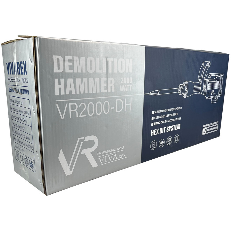 بتن کن تخریب 16 کیلویی ویوارکس مدل VR2000-DH دارای قلمهای مصرفی متنوع میباشد و حداکثر تعداد ضربه 1450 BPM در حالت تخریب را داراست. همچنین با دکمه قفل سوییچ برای ایجاد راحتی و آسانی در هنگام استفاده مداوم از این ابزار تجهیز شده است. بتن کن تخریب ویوارکس ابزارهایی با توان ورودی و ضربه بالا و بدنه بسیار مستحکم هستند تا بتوانند فشار ناشی از تخریبهای بزرگ را تحمل کرده و بدون آسیب دیدن عمل کنند. دارای مکانیزم روغنکاری برای کاهش استهلاک و افزایش طول عمر دستگاه است، دارای دسته گردان 360 درجه آنتی شوک برای اعمال کنترل بیشتر کاربر میباشد و همچین مجهز به موتور پر قدرت 2000 واتی با توان ضربه 60 ژول با عملکرد عالی میباشد. مجهز به جعبه فلزی و مقاوم برای حفظ و نگه داری که کاربرد بسیار بالایی دارد.