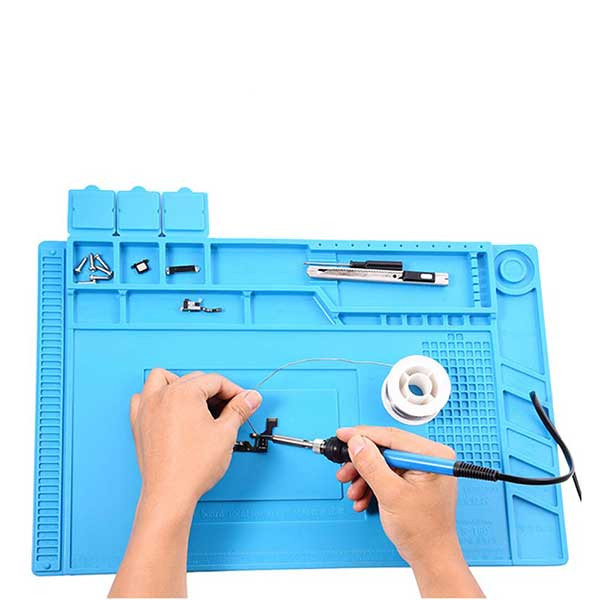 محصول پیش رو یک پد سیلیکونی نسوز مناسب برای تعمیر بردهای الکترونیک و موبایل و ... میباشد . بر روی این محصول چندین محل برای قرار گیری انواع قطعات SMD و انواع پیچ و آی سی و ... قرار دارد که بسیار کاربردی میباشد . همچنین محل قرار گیری قطعات SMD شماره گذاری دارد تا باتوجه به نوع قطعه بتوان قطعه مورد نظر را داخل محل های مورد نظر قرار داد.