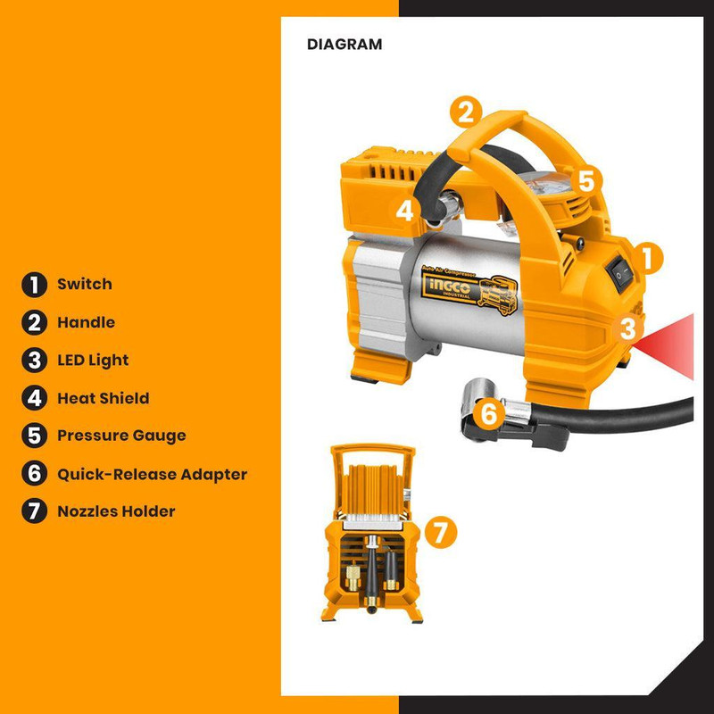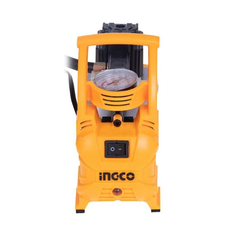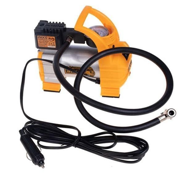 کمپرسور باد 12ولت اینکو مدل AAC1408، دارای طراحی خاص و منحصر به فرد شرکت معتبر اینکو است، طراحی این دستگاه به صورت تک سیلندر می باشد که می تواند فشاری برابر 140PSI یا 10 بار تولید می کند، این مینی کمپرسور می تواند در مواقع بسیاری به طور مثال هنگام پنچر شدن لاستیک، تنظیم نبودن باد لاستیک و ... از جمله مواردی است که هنگام عدم دسترسی به برق شهری به کمک شما بیاید.پنچرشدن لاستیک، تنظیمنبودن باد لاستیک، معیوببودن لاستیک و سایر موارد از جمله مشکلاتی است که در هنگام عدم دسترسی به برق شهری، نیاز به یک تلمبه بادی قابل حمل را پر رنگ میکند. کمپرسور باد 12 ولت اینکو یک دستگاه تولید باد سبک و قابل حمل است که قادر است با دو روش اتصال به فندک ماشین و اتصال مستقیم به باتری ماشین تغذیه شود و فشاری تا میزان ماکزیمم 140PSI یا 10 بار تولید نماید. طراحی این کمپرسور به صورت تک سیلندر است و میتواند با کمک مکانیزم ساخت خود، جریان بادی برابر با 35 لیتر بر دقیقه خارج نماید. جریان نامی این کمپرسور هوا 12 ولت 10 آمپر است و بر روی این دستگاه یک نمایشگر آنالوگ تعبیه شده است تا میزان هوای عبوری را با عقربه های خود نشان دهد. لوله باد این دستگاه طولی برابر با 80 سانتیمتر دارد و برای افزایش کارایی دارای 4 عدد نازل باد است تا بتوان با کمک آن لاستیک ماشین، توپ، دوچرخه، بالش، تشک، قایق بادی و... را به خوبی باد کرد. با این دستگاه میتوانید در تاریکی شب و در مکان های کم نور هم به کار بپردازید زیرا برای آن یک لامپ LED پر نور در نظر گرفته شده است. این مینی کمپرسور هوا برای استقامت بیشتر به پایه های مقاومی تجهیز شده است و بدنهی مستحکمی با طراحی ارگونومیک دارد که از جمله ویژگی های خوب و کاربردی آن است. این محصول دارای استاندارد CE اروپا است.