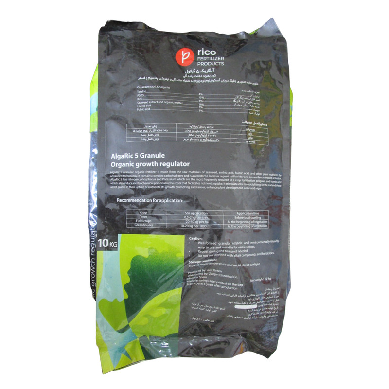 کود آلی آلگاریک 5 گرانوله از مواد اولیه جلبک دریایی، اسید آمینه، اسید هیومیک و سایر مواد مغذی با تکنولوژی پیشرفته ساخته شده است. این کود که حاوی کمپلکسی از کربوهیدرات هاست یک کود فوق العاده، یک بهساز خاک و فعال کننده تولید کمپوست عالی است. آلگاریک 5 گرانوله دارای نیتروژن، فسفر و پتاسیم که بیشترین سهم را در یک برنامه تغذیه ای گیاه شامل می شوند و نیز اسید هیومیک است که باعث ایجاد پتانسیل الکتروشیمیایی در ریشه ها شده و جذب مواد مغذی را تسهیل میکند. بنابراین مصرف کود جلبک دریایی در محاظت از گیاه و تغذیه آن بسیار حائز اهمیت است. ترکیبات هورمونی و مواد تنظیم کننده رشد مانند جیبرلین، اکسین ها و سیتوکنین های موجود در عصاره جلبک دریایی در طویل شدن سلولی، تسریع جوانه زنی بذر، ایجاد سیستم ریشه قوی، ایجاد گل، رشد برگ، افزایش طول میان گرهها، افزایش اندازه و کیفیت میوه، تاخیر در رسیدن میوه ها، یکدست شدن میوه ها و کاهش اثرات برخی آفات و بیماری های گیاهی موثر میباشد. همچنین آلگاریک 5 سبب افزایش پایداری و مقاومت گیاه در برابر شرایط نامطلوب محیطی مانند سرمازدگی، گرمای بیش از حد و خشکی میشود.