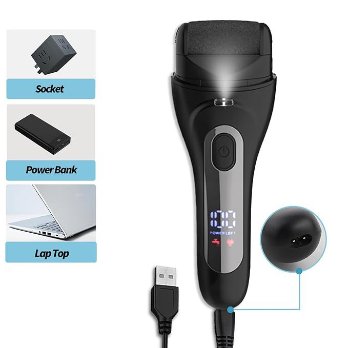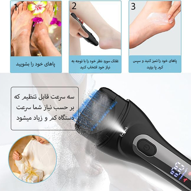 اقلام این سنگ پا:کابل شارژ,سه سری غلتک با مقاومت های مختلف که بر اساس نیازتان مورد استفاده قرار میگیرد. صفحه نمایشگر,سرعت قابل تنطیم,درپوش محافظ,چراغ LED از جمله قابلیت های این سنگ پا است.