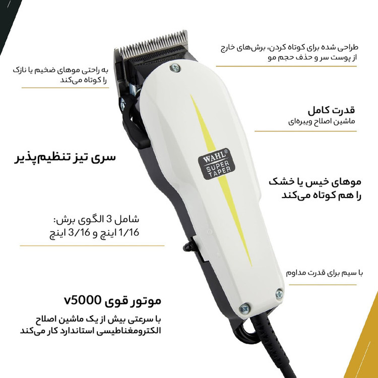همانطور که زنان به زیبایی ظاهر خود میپردازند، این موضوع برای مردان نیز از اهمیت ویژهای دارد. رسیدگی روزانه بهداشتی و آرایشی از قبیل شستشو و مرطوب کردن، استفاده از کرمهای مرطوب کننده، پاک کننده، شستشو دهنده و غیره کلیدی برای ایجاد پوستی زیبا و در نهایت ظاهری جذابتر است. اما داشتن پوست زیبا تنها راه رسیدن به ظاهری جذاب نیست بلکه پیرایش یا اصلاح موی سر و صورت میتواند جذابیت و زیبایی را به ارمغان بیاورد. به کمک پیرایش سر و صورت به فرمهای مختلف میتوان سبک متنوعی از ظاهر را ایجاد کرد. حتی برای رفتن به مهمانی میتوان پیرایش سر و صورت متفاوتی را برای خود در نظر گرفت. ماشین اصلاح وسیلهای است که بهراحتی این هدف را برآورده میکند. ماشین های اصلاحی که مخصوص اصلاح موی سر ساخته می شوند باید موتور قدرتمندی داشته باشند، زیرا موهای سر نسبت به صورت و بدن ضخیم تر بوده و تراکم بیشتری دارند. ماشین اصلاح Super Taper ساخت شرکت «وال» (Wahl) با داشتن موتور لرزشی V5000 مناسب استفاده برای اصلاح موهای ضخیم است. تیغهی ماشین اصلاح از جنس استیل پوشش داده شده با کروم است که در برابر زنگ زدگی مقاوم است. به کمک این تیغه میتوان موهای سر را در اندازههای 1 تا 3.5 میلیمتر کوتاه کرد. در کنار دستگاه، اهرم تنظیم چرخشی قرار دارد که اگر دستگاه را با دست راست بگیرد، با انگشت شست بهراحتی میتوان آن را در جای مناسب تنظیم کرد. به کمک این اهرم میتوان فاصلهی بین تیغههای بالا و پایین را تغییر داد و بدون استفاده از شانه، طول اصلاح دلخواه را تنظیم کرد. هنگامی که این اهرم به پایین فشار داده میشود، طول برش تیغهها افزایش مییابد و وقتی در بالاترین موقعیت قرار دارد، تیغهها در کمترین فاصله از هم قرار میگیرند. برای اصلاح مو در اندازههای مختلف 4 عدد شانهی اصلاح با طول برش 3 تا 13 میلیمتر ارائه شده که روی تیغه قفل میشوند. داخل جعبه شانه، برس تمیزکننده و روغن نیز قرار داده شده است. روی تیغهها دو پیچ چهارسو وجود دارد که برای تنظیم فاصله تیغهی پایین و بالا به کار میرود.