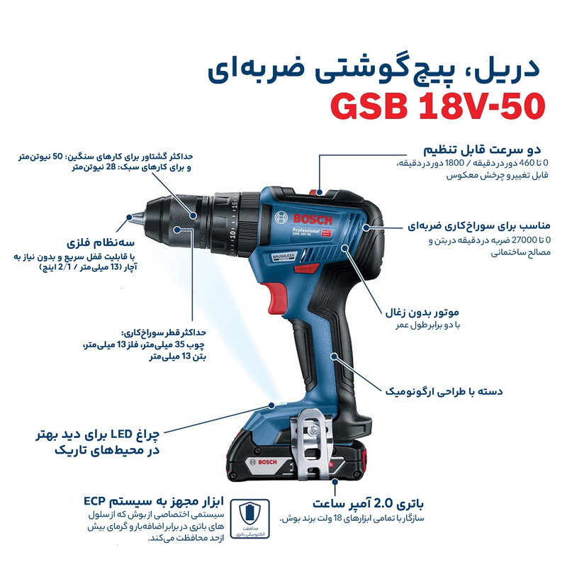 شرکت بوش آلمان که همیشه در تولید ابزار در دنیا کاملا بی رقیب بوده است اینبار با طراحی و تولید دریل شارژی 18 ولت مدل GSB 18V-50 Brushless دارای موتور بسیار پیشرفته بدون ذغال (موتور براشلس) ضد آب با طول عمر بسیار بالاتر (نسبت به موتورهای ذغالی ) که از تکنولوژی بسیار پیشرفته موتور EC بهره می برد و دارای دو باتری قدرتمند لیتیوم آیونی 2 آمپر ساعتی می باشد قدرت خود را به رخ بزرگان این عرصه کشیده است. عملکرد دریل پیچگوشتیهای شارژی ترکیبی از دو دستگاه دریل و پیچگوشتی شارژی است. این دستگاهها میتوانند با توجه به سرعت چرخش به یک دریل تبدیل شوند یا مانند پیچگوشتی شارژی برای پیچاندن پیچها مورد استفاده قرار گیرند. محصول فوق یکی از تولیدات شرکت بوش بوده که تحت عنوان مدل GSB 18V-50 به بازار عرضه میشود. این دستگاه از گشتاور بالایی برخوردار است و قدرت زیادی دارد. گشتاور این محصول در بیشترین حالت 50 نیوتنمتر واقعی است. قابلیت تنظیم گشتاور از دیگر مزایای این دریل پیچگوشتی شارژی است. از گشتاورهای بالا معمولا برای کار روی سطوح سخت و مقاوم استفاده میشود و گشتاورهای پایین برای انجام کارهای سبک و ظریف کاربرد بیشتری دارد. در این دستگاه میتوان سرعت چرخش را نیز همچون میزان گشتاور کنترل کرد. برای این منظور یک شستی دیمردار روی دستگاه تعبیه شده است که با کمک آن کاربر میتواند سرعت چرخش را با تغییر میزان فشار انگشت خود تغییر دهد. سرعت چرخش این دستگاه در دو بازهی 0 تا 460 و 0 تا 1800 دور بر دقیقه قابلتنظیم است. این دستگاه انرژی موردنیاز خود را از باتری لیتیوم یونی تامین میکند و برای این منظور به دو باتری 18 ولتی با ظرفیت 2 آمپرساعت بسیار پیشرفته و مقاوم در مقابل فاسد شدن و حرارت و با طول عمر بسیار بالا مجهز شده است که قابلیت نمایش میزان شارژ را دارند. در ساخت این محصول از سهنظام خودکار 13 میلیمتری استفاده شده است. برای نصب مته یا سری پیچگوشتی روی این سهنظام نیازی به آچار ندارید و این کار تنها با نیروی خود دستگاه و نگهداشتن سهنظام با دست انجام میشود. این محصول دارای یک لامپ LED بوده که با فشردن شستی دستگاه روشن شده و سطح موردنظر را برای کاربر روشن میکند.تمام ویژگی های این دریل شارژی چکشی باعث شده این محصول در نوع خود در دنیا بی رقیب باشد
