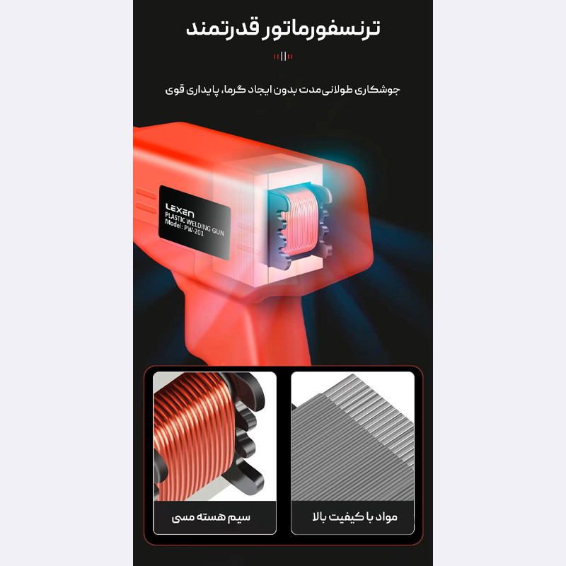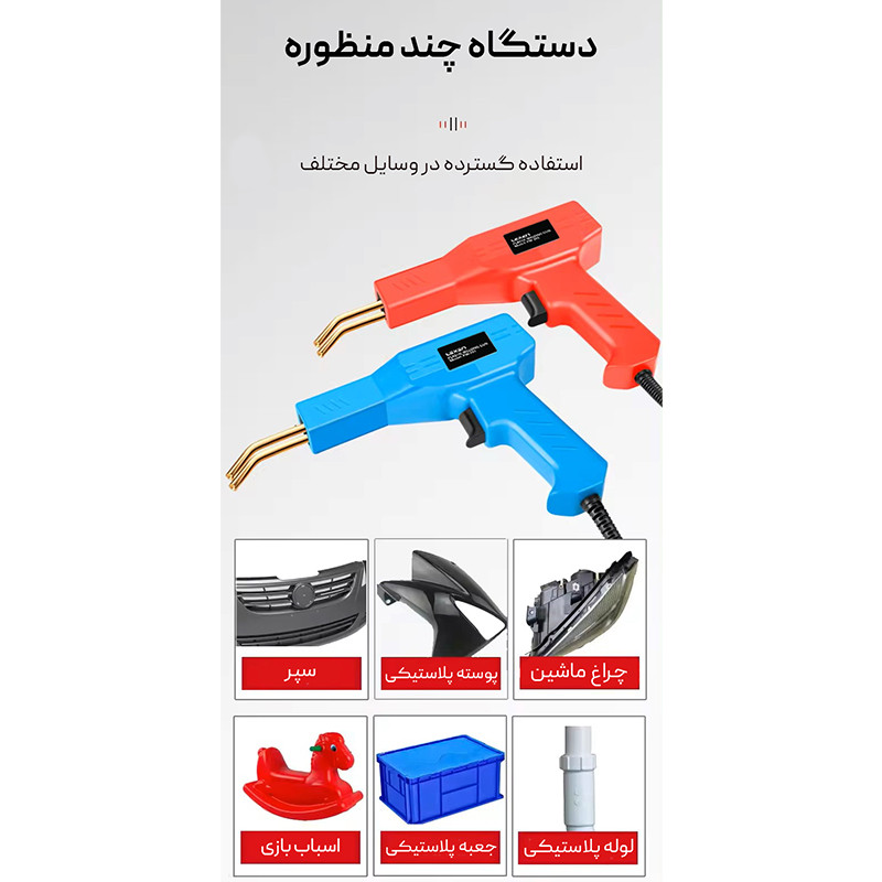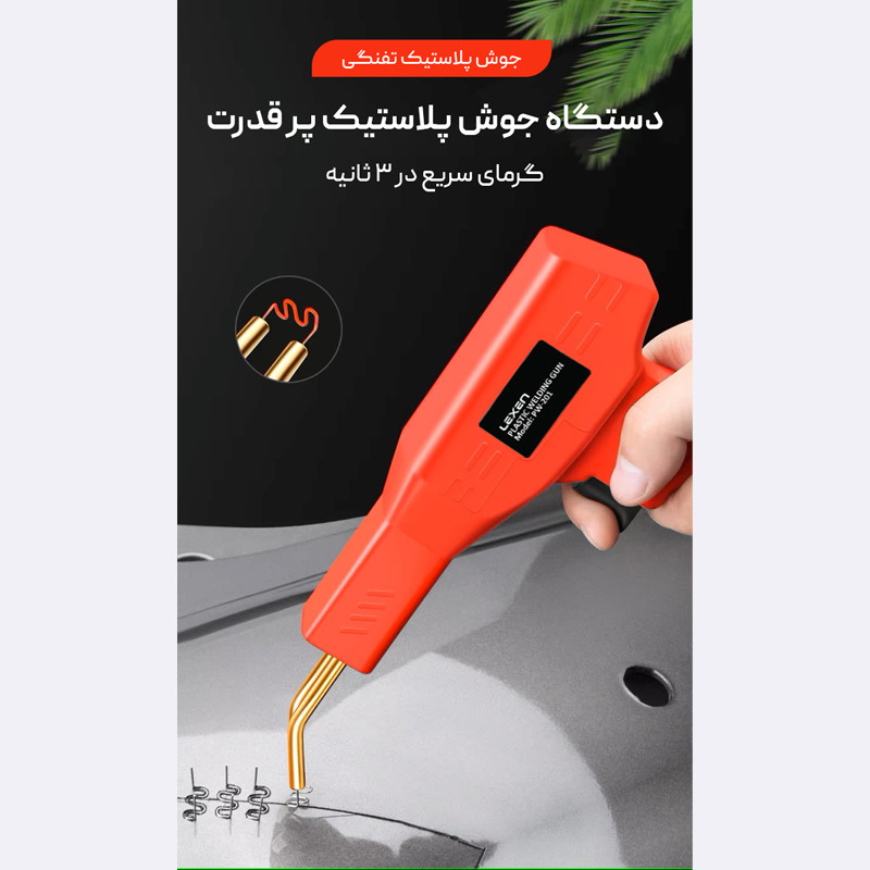 دستگاه دوخت و جوش پلاستیک حرارتی پرتابل برند لکسن قابلیت جوش قطعات پلاستیکی را دارد و برای اتصال دو قسمت پلاستیکی به یکدیگر مورد استفاده قرار میگیرد. ویژگی این دستگاه سرعت بالا داغ شدن زیر 3 ثانیه میباشد. با استفاده از دستگاه منگنه حرارتی پرتابل میتوانید برای اتصال کوتاه مقاومتی گیره ای استفاده کنید که برای افزایش عمر قطعات پلاستیکی کاربرد دارد. همچنین میتوانید مانع از پیشروی ترک قسمت پلاستیکی شوید و از آن برای تعمیر قطعات مختلف مانند سپر خودرو، قطعات پلاستیکی و سطح پلاستیکی استفاده کنید. در کیف این دستگاه به تعداد مورد نیاز و مدل های مختلفی از منگنه برای جوش پلاستیک قرار داده شده است.