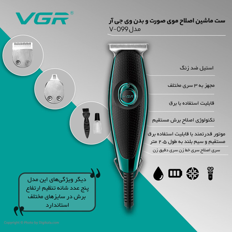 مجهز به 3 سری مختلف جهت اصلاح سری خط زن سری دقیق زن (جهت اصلاح کناره های ریش و سبیل)موتور قدرتمند با قابلیت استفاده به صورت برق مستقیم بلند به طول 2.5 متر5 عدد شانه تنظیم ارتفاع برش در سایزهای مختلف استاندارد CE