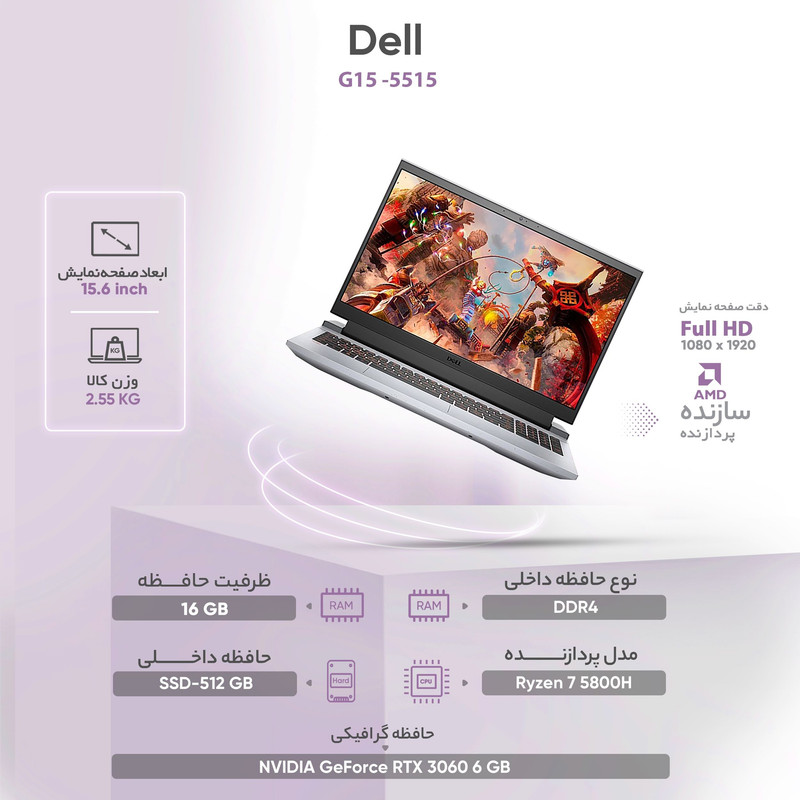 بسیاری از کاربران به دنبال خرید لپتاپهای قدرتمندی هستند که در کنار بهره بردن از مشخصات فنی قدرتمند، توانایی ارائه عملکرد بسیار خوبی را در اجرای بازیهای سنگین و بهروز دنیا داشته باشند. یکی از همین لپتاپهای گیمینگ و قدرتمند موجود در بازار، مدل G15 -5515 شرکت Dell است که توانایی ارائه عملکرد بسیار خوبی در اجرای بازیهای سنگین با گرافیک بالا را دارد. این لپتاپ به صفحهنمایش با ابعاد 15.6 اینچ و رزولوشن 1080×1920 پیکسل از نوع IPS مجهز شده که توانایی ارائه حداکثر روشنایی 300 نیت را هم دارد. صفحهنمایش مات در نظر گرفته شده برای این لپتاپ سوای ارائه وضوح تصویر بسیار باکیفیت، سبب شده تا در استفاده طولانی مدت خستگی برای چشم بههمراه نداشته باشد. در بخش مشخصات سختافزاری هم Dell چیزی برای G15 -5515 کم نگذاشته و حضور پردازنده مدل 5800H سری Ryzen 7 شرکت AMD با توانایی ارائه حداکثر فرکانس کاری 4.4 گیگاهرتز در کنار پردازنده گرافیکی بسیار قدرتمند GeForce RTX 3060 شرکت NVIDIA سبب شده تا با خیال راحت بازیهای سنگین با گرافیک بالا را با این لپتاپ اجرا کنید و از گیمپلی بسیار جذاب لذت ببرید.