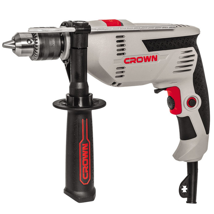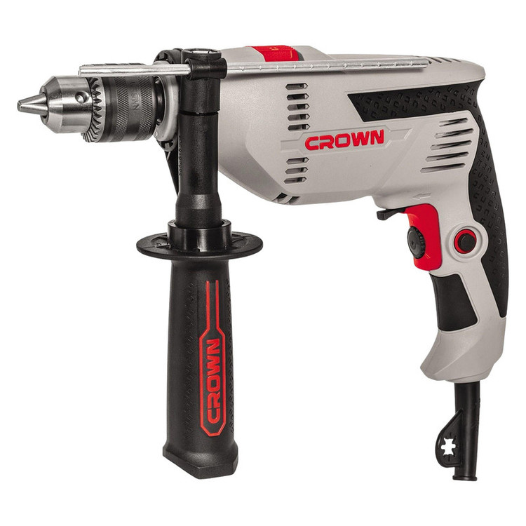 دستگاه فوق یکی از محصولات تولیدی شرکت «کرون» (Crown) است که تحت عنوان مدل «CT10128» به بازار عرضه میشود. این دریل با توان 600 وات، دستگاهی میانرده محسوب میشود که برای انجام کارهای سبک تا نیمهسنگین مناسب است. این دریل برقی از قابلیت کنترل سرعت چرخش برخوردار است و بازهای برابر 0 تا 2800 دور بر دقیقه دارد. برای تنظیم سرعت چرخش دستگاه یک شستی دیمردار روی دریل تعبیه شده که کار با آن بسیار آسان است. سهنظام این دریل از نوع آچارخور 13میلیمتری بوده و برای نصب مته روی آن به آچار نیاز دارید. از دیگر ویژگیهای این محصول میتوان به قابلیت گردش آن بهصورت راستگرد و چپگرد اشاره کرد. این دستگاه اگرچه توان بالایی ندارد، برای سوراخکردن سطوح سیمانی و گچی نیز مورد استفاده قرار میگیرد که این ویژگی با توجه به قابلیت چکشیبودن دستگاه حاصل شده است. حداکثر قطر سوراخکاری این دریل چکشی در چوب، فلز و مصالح بهترتیب برابر 20، 13 و 13 میلیمتر است.