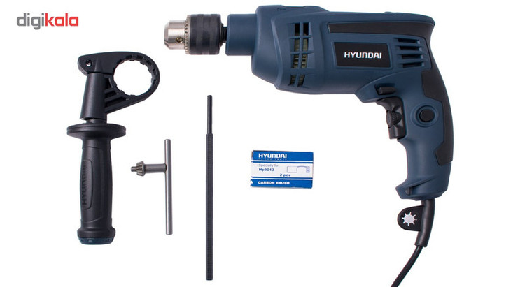 اگر قصد تهیهی یک دریل چکشی مناسب با قدرتی قابل قبول دارید، میتوانید از دستگاه فوق استفاده کنید. این دریل از توانی برابر 900 وات برخوردار است و از قابلیت کنترل سرعت گردش سود میبرد. میزان سرعت گردش این دستگاه توسط کلیدی چرخشی که روی شستی قرار دارد تنظیم میشود. بازهی سرعت چرخش این دستگاه 2800-0 دور بر دقیقه است. از دیگر مزایای این دستگاه میتوان به قابلیت چرخش ساعتگرد و پادساعتگرد آن اشاره کرد. سه نظام این دریل چکشی از نوع 13 میلیمتری آچارخور بوده و حداکثر قطر سوراخکاری آن در چوب، فلز و مصالح به ترتیب برابر 25، 10 و 13 میلیمتر است. با کمک این دستگاه میتوانید با دقت و تسلط بیشتری به کار خود بپردازید که این ویژگی به دلیل وجود دستهی کمکی و قفل سوییچ این دریل حاصل شده است. این دسته قابل تنظیم بوده و از قابلیت چرخش 360 درجه سود میبرد. دستگاه فوق با نام « HP9013 » شناخته میشود و یکی از تولیدات شرکت «هیوندای» (Hyundai) است.
