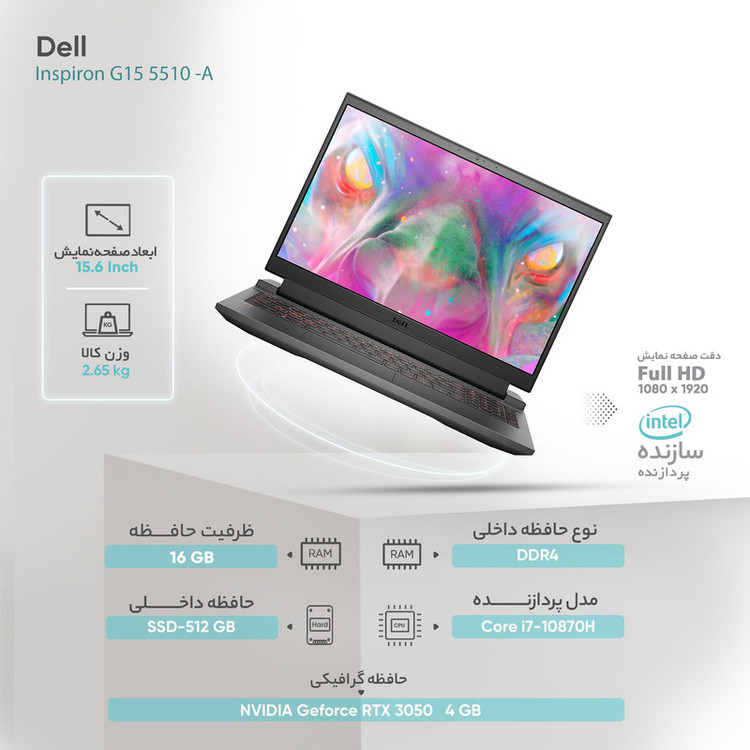 دل یکی از محبوبترین و قديميترین شرکتهای آمریکایی تولید محصولات کامپیوتری از جمله لپتاپ است که در تمام دنیا به عنوان یکی از برندهای شناخته شده حرفهای و سخت کار مشغول فعالیت است. این شرکت لپتاپهای متنوعی را با سریهای متفاوت تولید میکند که هرکدام از آنها ویژگیهای خاصی دارند. یکی از سریهای پرفروش این شرکت هم لپتاپهای گروه Insprion سري G هستند که از کاربری عمومی تا حرفهای و گيم را پوشش میدهند. لپتاپ 15.6 اینچی مدل Insprion G15 5510 یکی از محصولات پرقدرت برند دل است. دل در این کانفیگ از پردازندهی مرکزی جدید i7-10870H اینتل استفاده کرده که با كش 16 مگابايت بهخوبی از پس محاسبات حرفهای برمیآید. پردازشگر گرافیکی حرفه ای و قدرتمند GeForce RTX 3050 GDDR6 با 4 گیگابایت حافظهی اختصاصی از دیگر مشخصات فنی این مدل هستند. صفحهنمایش 15 اینچی FHD این لپتاپ روکش مات دارد. این محصول هم مانند بسیاری محصولات برند دل از کیفیت و دوام بالایی بهره میبرد. وزن 2.65 کیلوگرمی، این لپتاپ را به نمونهای ایدهآل برای جابهجایی راحت تبدیل کرده است. به همین دلیل میتوان از این محصول بهعنوان یک لپتاپ مناسب برای کاربریهای متفاوت یاد کرد. طراحی شیک و زيبا، تاچپد یک تکه، پورتهای متعدد از جمله ویژگیها و امکانات این محصول هستند. در مجموع اگر به دنبال خرید یک لپتاپ برای انجام امور روزمره و اجرای برنامههای محاسباتی سنگین و گرافيك و گيم هستید و میخواهید آن را همیشه با خود جابهجا کنید، این محصول دل میتواند یکی از گزینههای خوب باشد.