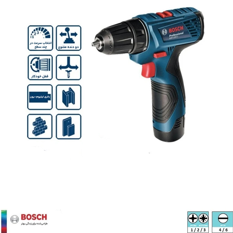 دریل پیچ گوشتی بوش مدل GSR-120LI+EXTRA به همراه مجموعه 25 عددی سری پیچ گوشتی