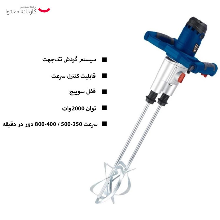 میکسر دو میل HP2259 هیوندای دارای توان 2000وات می باشد . این دستگاه دارای دو میل می باشد.این دستگاه دارای قفل سوییچ و قابلیت کنترل سرعت 6 حالته و گیربکس دوحالته می باشد.این دستگاه عملکرد با سرعت 250-500 / 400-800 دور در دقیقه دارا می باشد.برای مخلوط کردن مواد غلیظ و گل مانندی مثل سیمان و میزانهای کم حجمی از بتن و ملات و برای مخلوط کردن مواد رقیقی مثل دوغاب، رنگ و غیره و مناسب برای کارهای صنعتی و کارگاهی می باشد