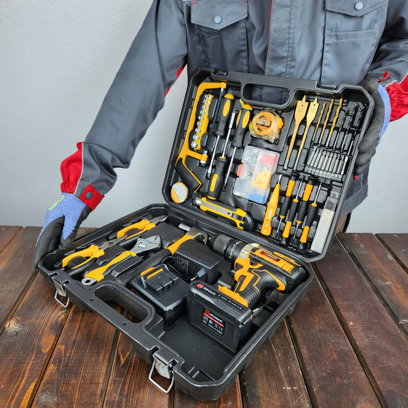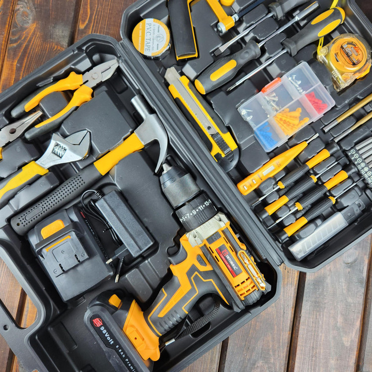 این دستگاه مجموعه ای کامل به همراه انواع ابزار الات جهت تمامی امور خانگی، اداری و ... می باشد که دریلی چکشی با سه نظام 13 میلیمتری تمام فلزی دارد که برای کارهای متعدد و سخت قابل استفاده است. گیربکس این دریل تقویت شده و بسیار قدرتمند است و از عهده امور مختلف بر میآید. این دستگاه دارای دو عدد باتری لیتیوم یون 98 ولت می باشد. دریل با گشتاور فوق العاده 35 الی 60 نیوتن متر می باشد. دارای دریل با سرعت 0 الی 600 و 0 الی 1500 دور بر دقیقه می باشد.باتری ها تولید جدید و دستگاه دارای دیمر و تنظیم سرعت می باشد. دارای چراغ جهت کار در محیط های تاریک می باشد قابلیت چپگرد و راستگرد دارد دارای کلیه ابزارهای مصرفی شامل؛ آچار فرانسه سایز 8، انبردست، دمباریک، چکش، بکس تک سایز 4 تا 13 میلیمتر، متر 3 متری، پیچ گوشتی دوسو و چهارسو سایز بزرگ، مته آهن سایز 3، 4 و 5 ، مته چوب سایز 3، 4 ،5 میلیمتر، مته برگی سایز 16 و 20 ، دارای 9 عدد نوک پیچ گوشتی، تبدیل نوک پیچ گوشتی به بکس، چسب برق، کاتر، فازمتر دیجیتال، 5 عدد تیغ کاتر، دو سایز پیچ گوشتی موبایلی دو سو و دو سایز پیچ گوشتی موبایلی چهارسو، کمان اره چوب و فلز، مجموعه سایزبندی پیچ و رولپلاک می باشدکیفیت عالی می باشد همراه کیف BMC حرفه ای عرضه میگردد