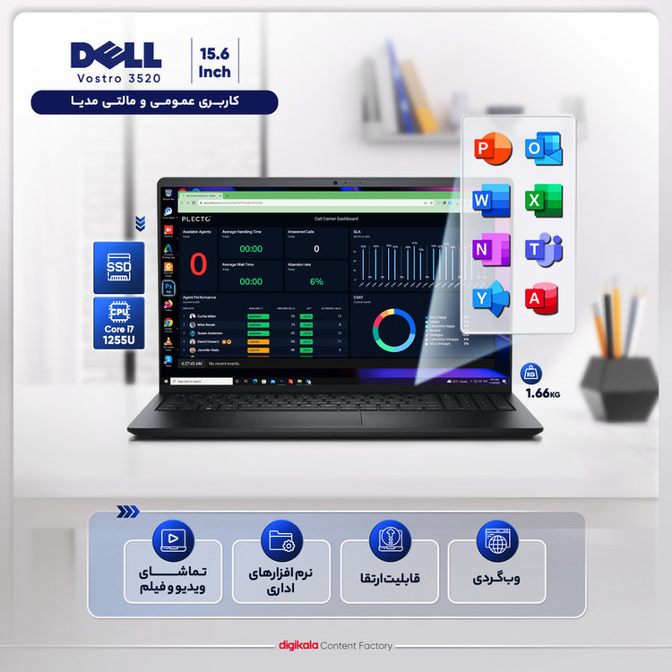 لپ تاپ Vostro 3520 یکی از سری لپ تاپهای جذاب دل است که ویژگیهای جذابی را برای استفاده عمومی ارائه میدهد. با داشتن وزن 1.66 کیلوگرم باید بگوییم این لپ تاپ یکی از بهترین انتخابها برای کسانی است که نیاز به حمل روزانه آن دارند. صفحه نمایشگر 15.6 اینچی استاندارد دارای پنل IPS با وضوح فول اچدی است و نرخ نوسازی صفحه 120 هرتز دارد که عملکرد روان آن را تضمین میکند. در بخش پردازنده، تراشه نسل 12 اینتل Core i7 را داریم که با داشتن 10 هسته و 12 رشته و حداکثر فرکانس 4.7 گیگاهرتز به خوبی از پس کارهای عمومی و مختلف برمیآيد. در این لپ تاپ گرافیک مجزا وجود ندارد و به همین دلیل هم نمیتوانید برای کارهای سنگین گرافیکی روی آن حساب کنید. در نهایت وجود پورتهای متنوع مانند HDMI، پورت LAN، شیار کارت حافظه و USB خیال شما را از کار با آن راحت میکند.