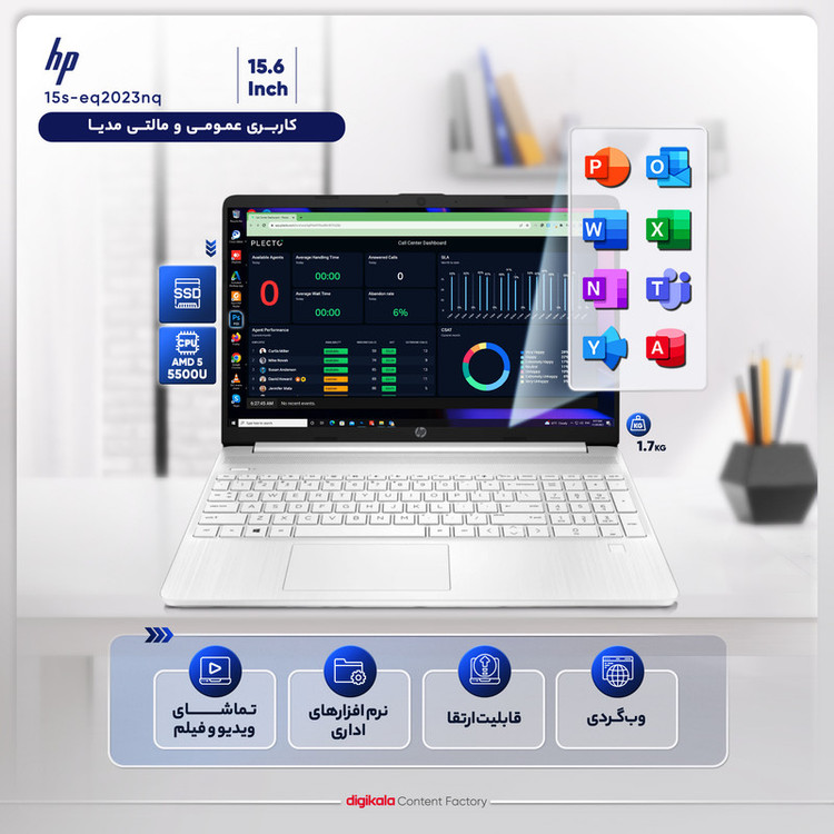 اچپی سابقهی طولانی در تولید لپتاپهای متنوع در اکثر بازههای قیمتی برای برطرف کردن نیاز کاربران دارد. لپتاپ 15s-eq2023nq به عنوان لپتاپی ساده و کاربردی برای انجام امور روزمره و عمومی در دسترس قرار دارد و گزینهی مناسبی برای استفاده در محیط کار و تحصیل خواهد بود. پردازنده مرکزی Ryzen 5 مدل 5500U به ۶ هسته و ۱۲ رشته مجهز شده و یکی از بهترین گزینهها برای این ردهی کاربری به حساب میآید. در کنار این بخش، پردازنده گرافیکی Radeon به صورت مجتمع قرار گرفته که برای انجام پردازشهای سبک طراحی شده و در ضمن مصرف باتری مناسبی دارد. حافظه رم DDR4 با سرعت ۳۲۰۰ مگاهرتز برای تضمین عملکرد روان سیستم کافی به نظر میرسد. استفاده از حافظهی SSD پرسرعت به معنی کاهش زمان بوت و روشن شدن سیستم، انتقال فایلها و بارگذاری برنامهها در مقایسه با هارددیسکهای سنتی است و به بهبود تجربهی کاربری کمک شایانی میکند. صفحهنمایش ۱۵.۶ اینچی رزولوشن ۱۹۲۰ در ۱۰۸۰ داشته و به لطف استفاده از پنل IPS زوایای دید گسترده و جلوه و دقت رنگ مناسبی دارد. نرخ بهروزرسانی ۶۰ هرتز و حداکثر روشنایی ۲۵۰ نیت برای این ردهی کاربری کافی است. نور پس زمینه کیبورد، باتری سه سلولی با ظرفیت ۴۱ وات ساعت و طراحی ساده و وزن سبک از ویژگیهای دیگر 15s-eq2023nq هستند.