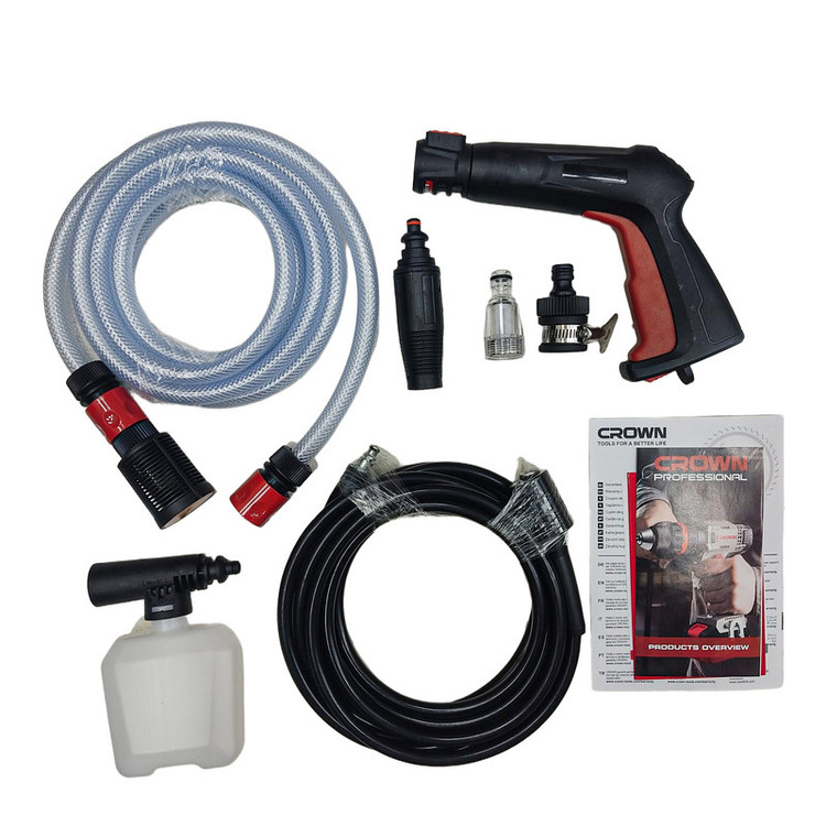 تفنگ با ورودی آب جدید، ۱۰ متر شلنگ فشار قوی، فیلتر بیرونی، ۲.۵ متر شلنگ آب، مخزن مایع شوینده، تفنگ آب پاش، لنس