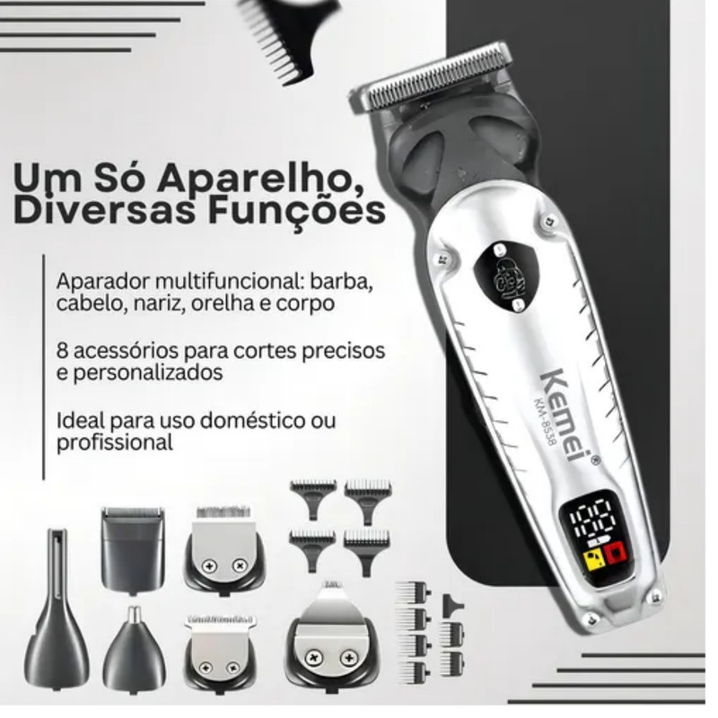 تریمر km-۸۵۳۸ ، محافظ تیغه ، 7 عدد فیش تریمر مختلف، 4عدد شانه اصلاح ۱، ۳، ۵، ۷ میلیمتر و 4عدد شانه اصلاح ۳، ۶، ۹، ۱۲ میلیمتر و ۲عدد اینچ ، کابل شارژر USB ، برس تمیز کننده
