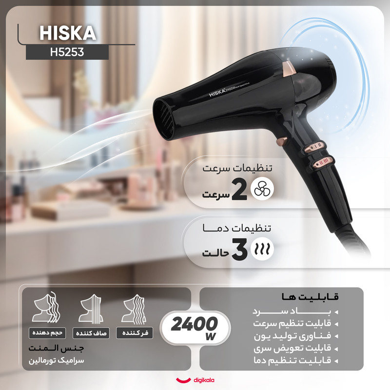 تکنولوژی آیونیک ( جهت جلوگیری از خشکی و وز شدن موها)- دکمه جداگانه برای استفاده از باد سرد-قابلیت تنظیم دما در سه حالت- موتور AC پرقدرت 2400واتی