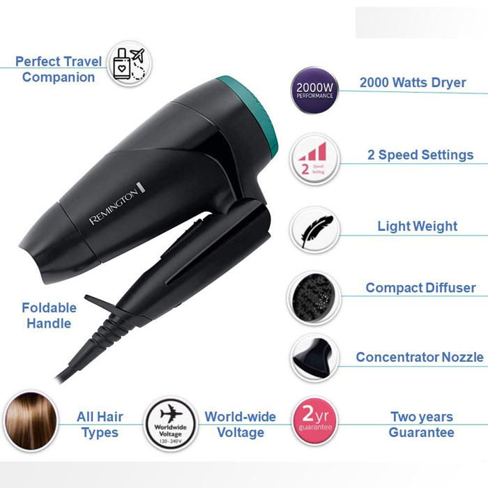 شرکت آمریکایی رمینگتون از قدیمی ترین و معتبرترین تولید کنندگان لوازم شخصی برقی میباشد که برای هر نوع کاربردی تولیدات حرفه ایی دارد. در حال حاضر برند رمینگتون مارک اول سشوار و اتو مو و نیز بزرگترین سازنده در بین تمامی تولید کنندگان این دستگاه ها میباشد و برای هر رده کاربری مدلهای فراوانی دارد. سشوار مسافرتی رمینگتون مدل D1500 E51 دستگاهی بسیار کارا برای خشک کردن و حالت دهی و نیز حجم دادن به موها میباشد. طراحی جمعوجور با برخورداری از دسته تاشو قرارگیری دستگاه را در هر کیف و چمدانی امکانپذیر میکند. همچنین وزن سبک دستگاه موجب نگهداری آسان و بدون دردسر سشوار درون دستها میشود. این دستگاه با توان مصرفی 2000 واتی و اعمال جریان هوایی قدرتمند، فرایند خشک کردن موهای سر را به سرعت انجام میدهد. به کمک دکمه قرار گرفته بر روی دسته سشوار مو به آسانی تنظیمات مربوط به دما و حرارت بهطور همزمان صورت میگیرد؛ تعداد دو سطح تنظیم حرارت و سرعت از طریق تعبیه یک کنترل کننده دکمهای در این سشوار انجام میگرد. 2 عدد سری برای دستگاه در اقلام جانبی قرار داده شده است این سریها شامل 1 عدد سری متمرکزکننده جریان هوا برای خشک کردن و حالت دهی به موها و یک عدد سری دیسپانسر برای حجم دادن به موها میباشد. همچنین با کابل برق 1.8 متری قدرت مانور با سشوار بالا میبود. تعبیه حلقه در بخش مربوط به سری کابل امکان آویزان کردن سشوار در محل مورداستفاده را فراهم میکند. از لجاظ کیفیت ساخت بدنه و اجزای داخلی دستگاه این مدل مانند سایر سشوارهای رمینگتون کیفیت ساخت بالایی دارد و موتور قدرتمند بکار گرفته شده در این مدل سرعت بادی معادل 60 کیلومتر بر ساعت تولید میکند که برای یک سشوار مسافرتی واقعا کم نظیر میباشد و با خیلی از سشوارهای خانگی برابری می کند.