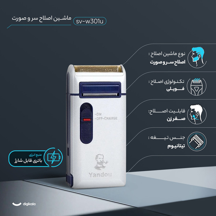 ماشین اصلاح موی سر و صورت مدل sv-w301u، طراحی ارگونومیک، قابلیت اصلاح با شماره صفر، منبع انرژی با باتری، تکنولوژی اصلاح به صورت برش مستقیم