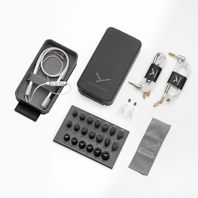 7 جفت ایرتیپ (سری) سیلیکونی، 3 جفت سری کامپلای (فوم)، کابل اتصال سیمی 3.5mm ، کابل بالانس 4.4mm ، کیف مخصوص حمل ، پارچه مخمل تمیزکننده و دفترچه راهنما