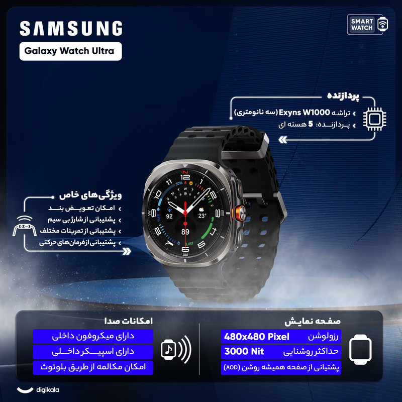 قابلیتهای ساعت هوشمند : کنترل موسیقی (Music Player) , قابلیت مکالمه از طریق بلوتوث , قابلیت تغییر طرح ساعت یا تم , صفحه همیشه روشن (Always-on Display) , پشتیبانی از دستیار صوتی